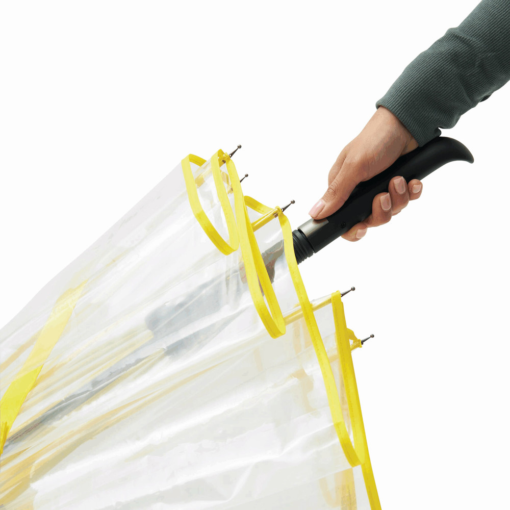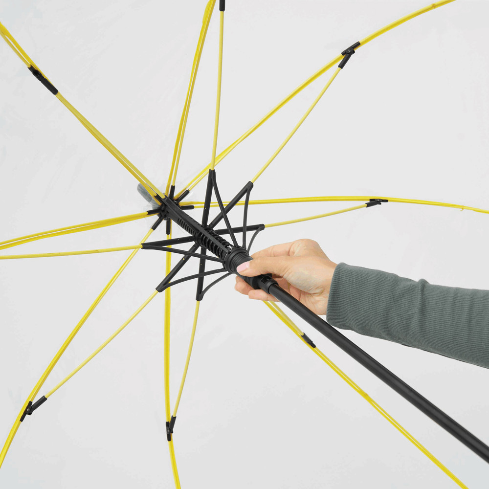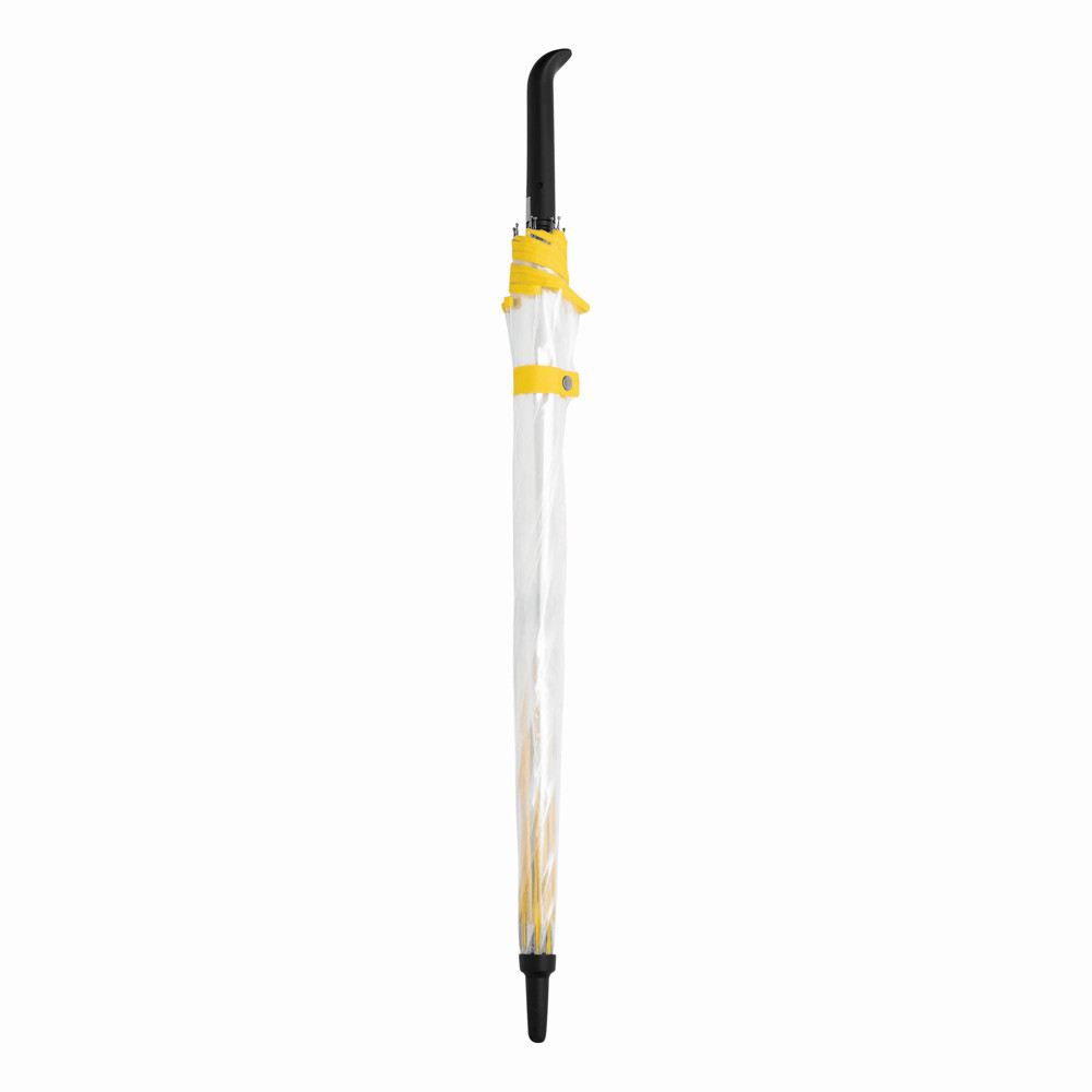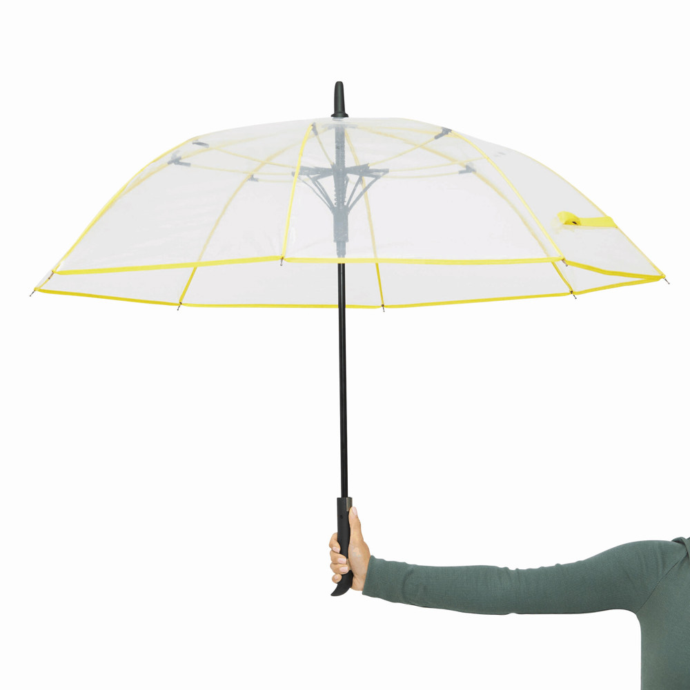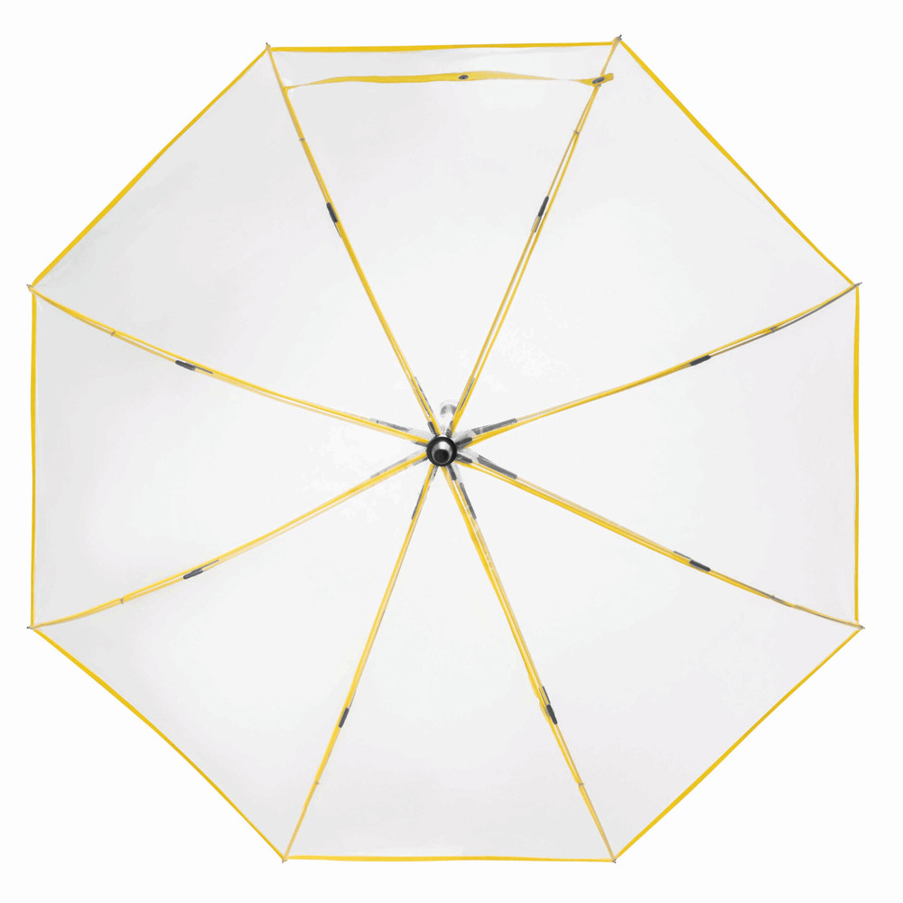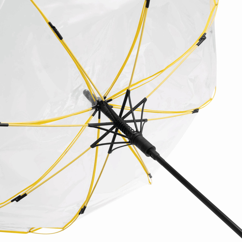Automatic windproof stick umbrella VIP: metal shaft, coloured fibreglass ribs with metal tips, plastic top, plastic handle with integrated press button, transparent POE canopy with coloured binding, closure with press button