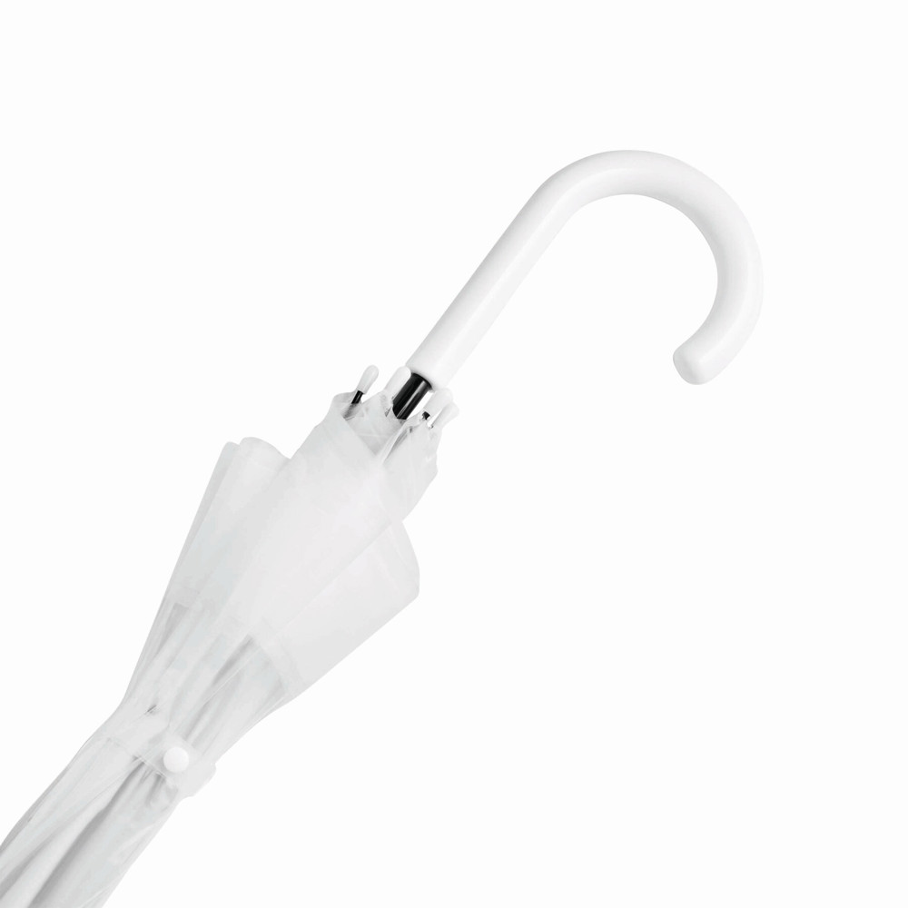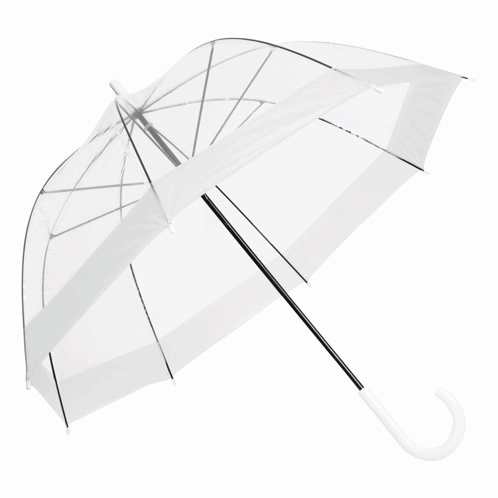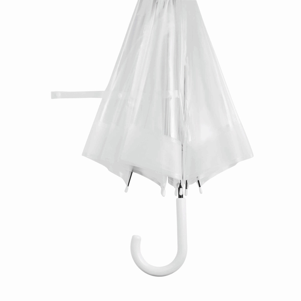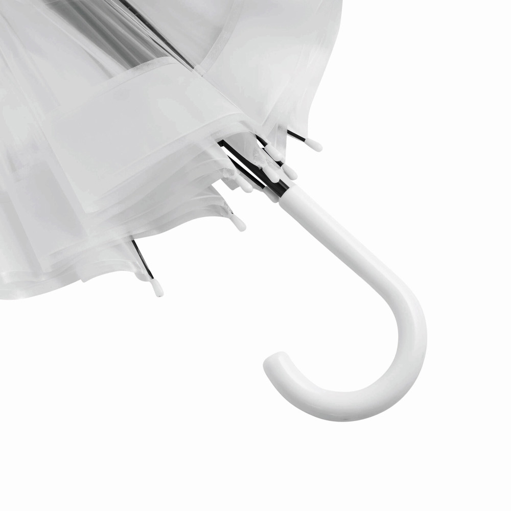 Dome-shaped umbrella HONEYMOON: metal shaft and ribs, plastic tips and top, plastic crook handle, transparent POE canopy with coloured border, closure with press button