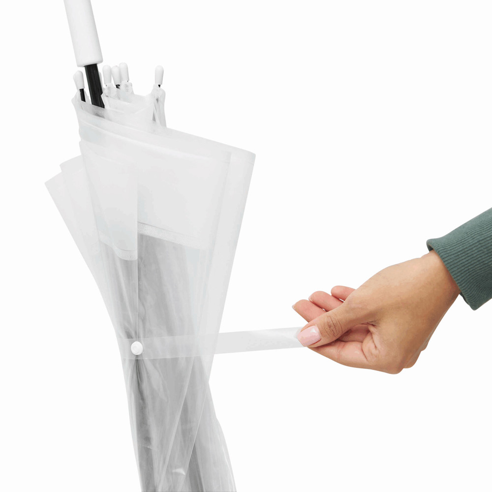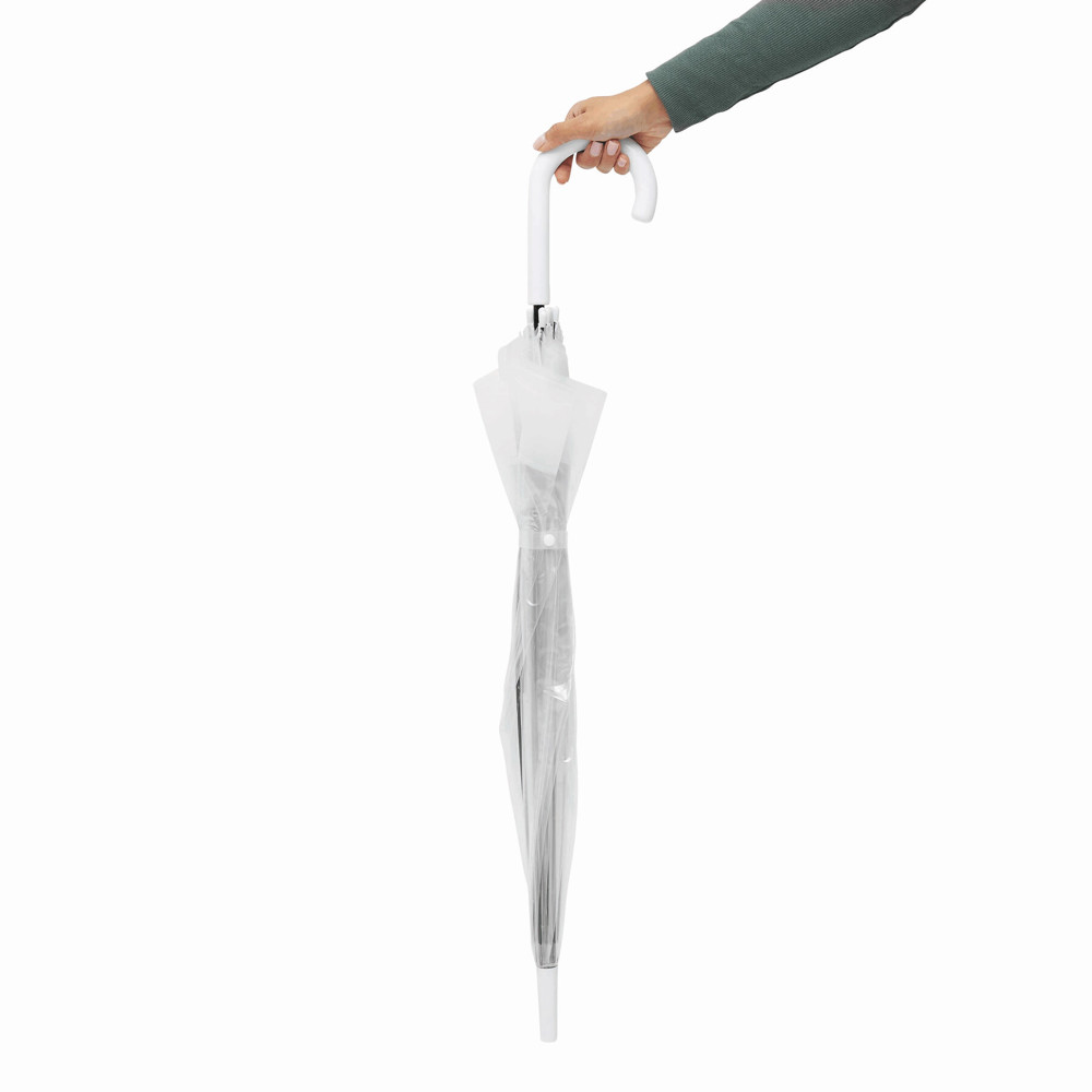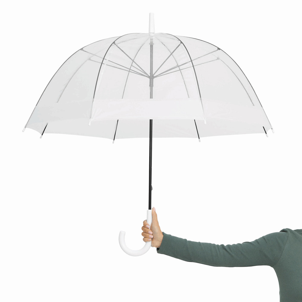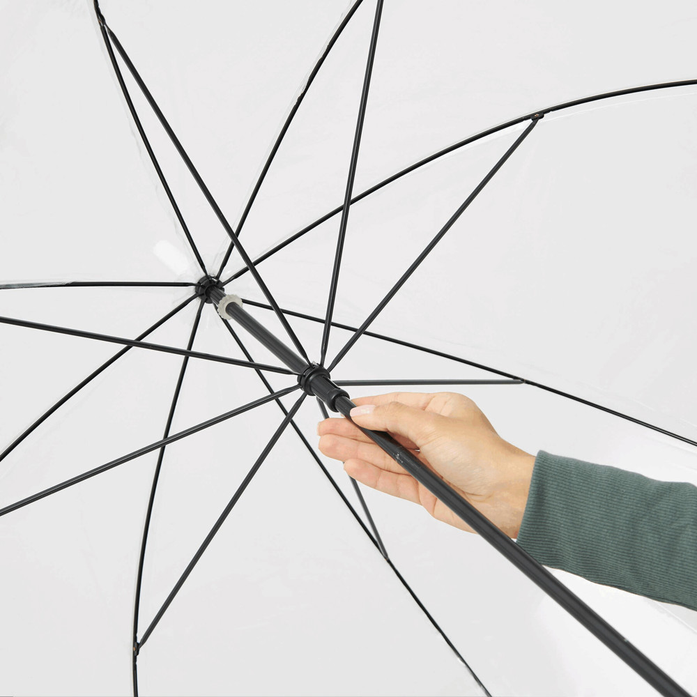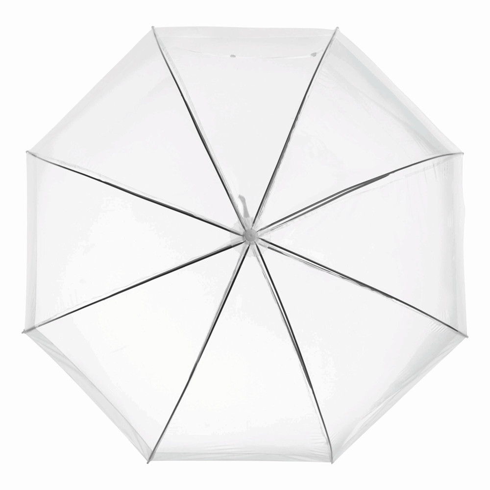 Dome-shaped umbrella HONEYMOON: metal shaft and ribs, plastic tips and top, plastic crook handle, transparent POE canopy with coloured border, closure with press button