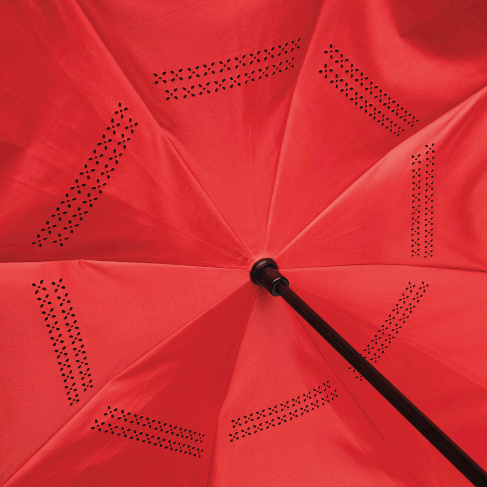 Stick umbrella FLIPPED: with reversed opening and closing mechanism, with safety runner, free hands thanks to C-shaped handle, twin cover with ventilation design to avoid stalled air, metal shaft and fibreglass ribs, with metal tips, polyester-pongee canopy, closure with Velcro