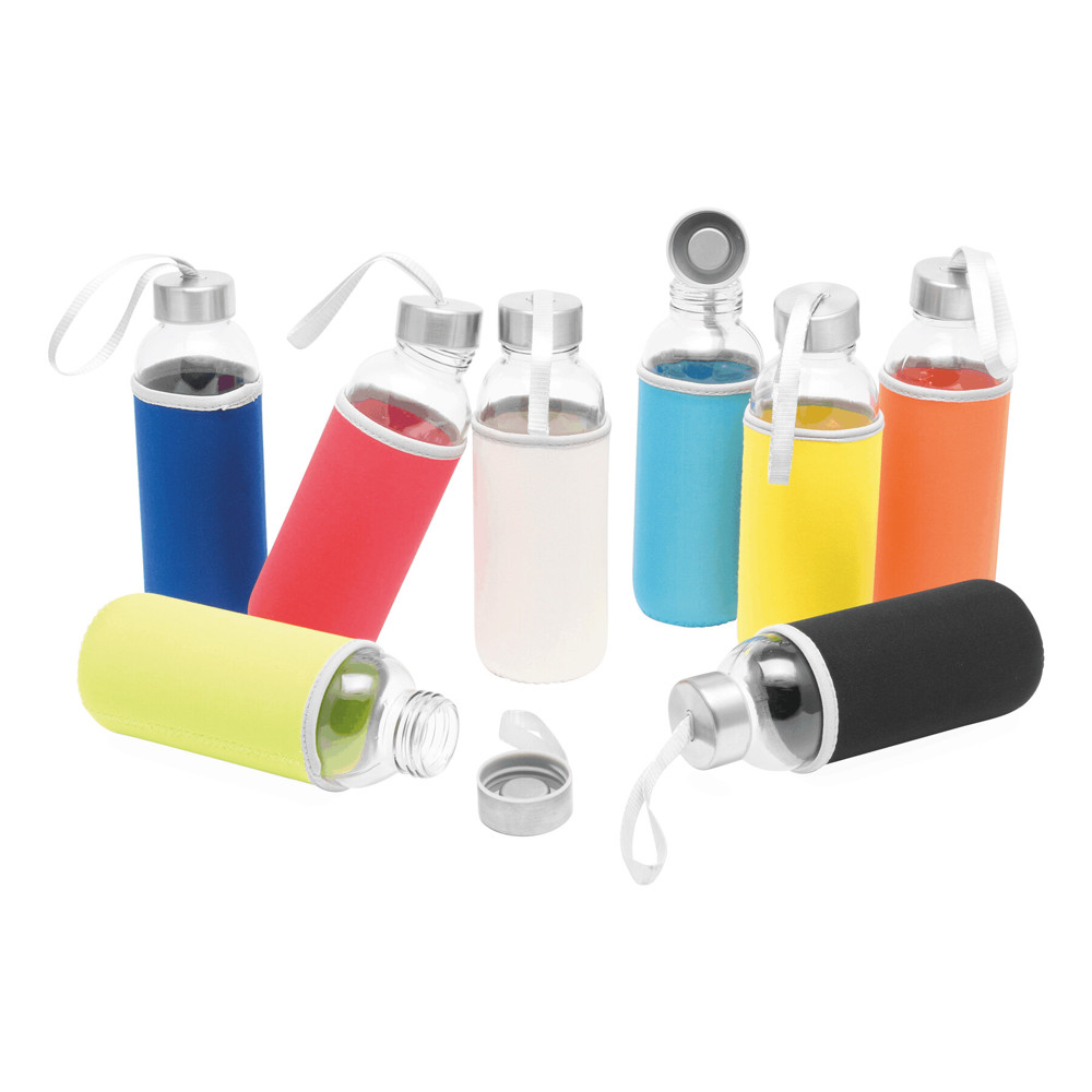 Glass bottle TAKE WELL: screw-on lid and carrying loop, incl. coloured protective sheath, capacity approx. 450 ml, in a box
