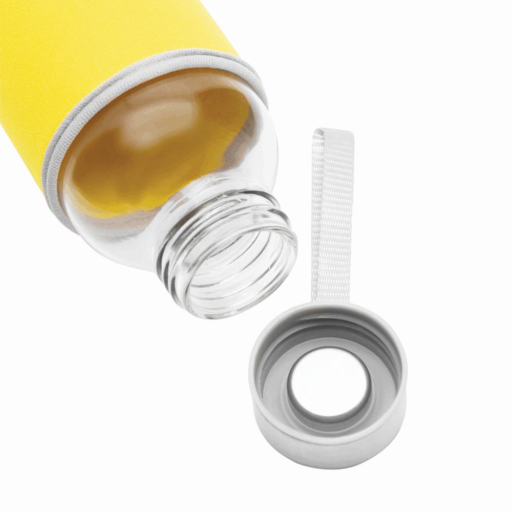 Glass bottle TAKE WELL: screw-on lid and carrying loop, incl. coloured protective sheath, capacity approx. 450 ml, in a box