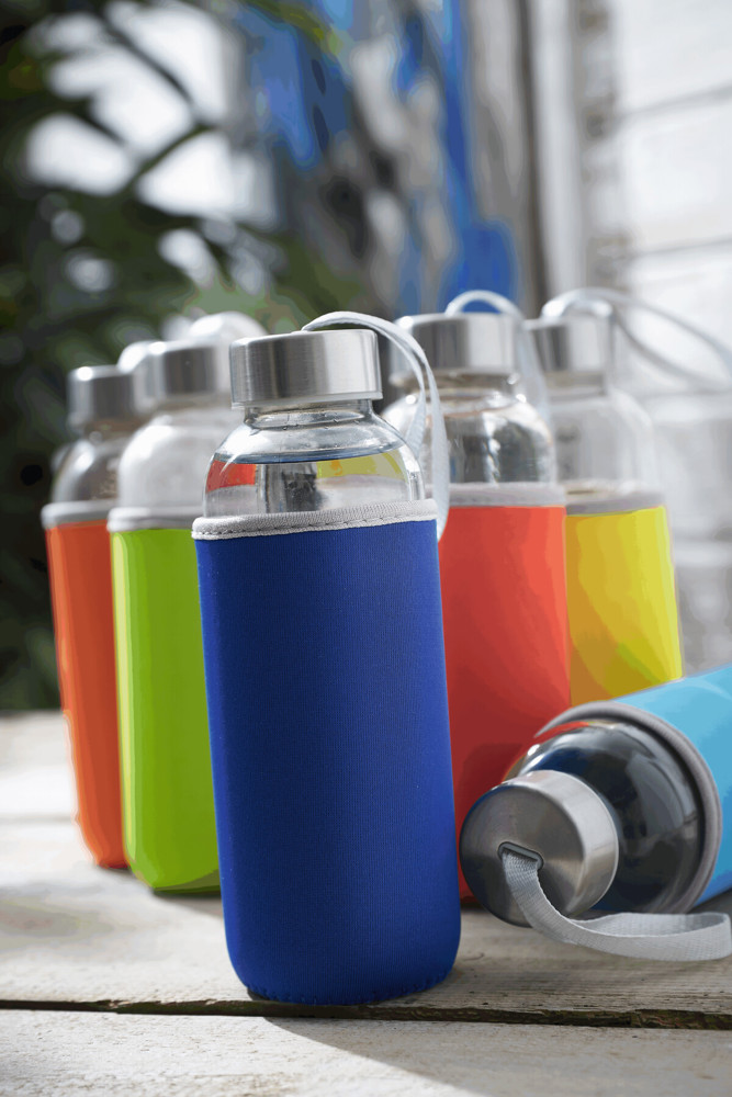 Glass bottle TAKE WELL: screw-on lid and carrying loop, incl. coloured protective sheath, capacity approx. 450 ml, in a box
