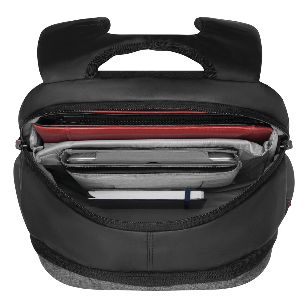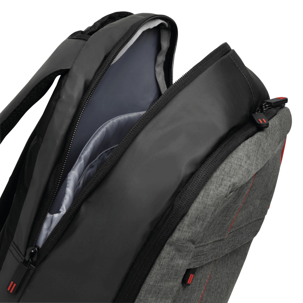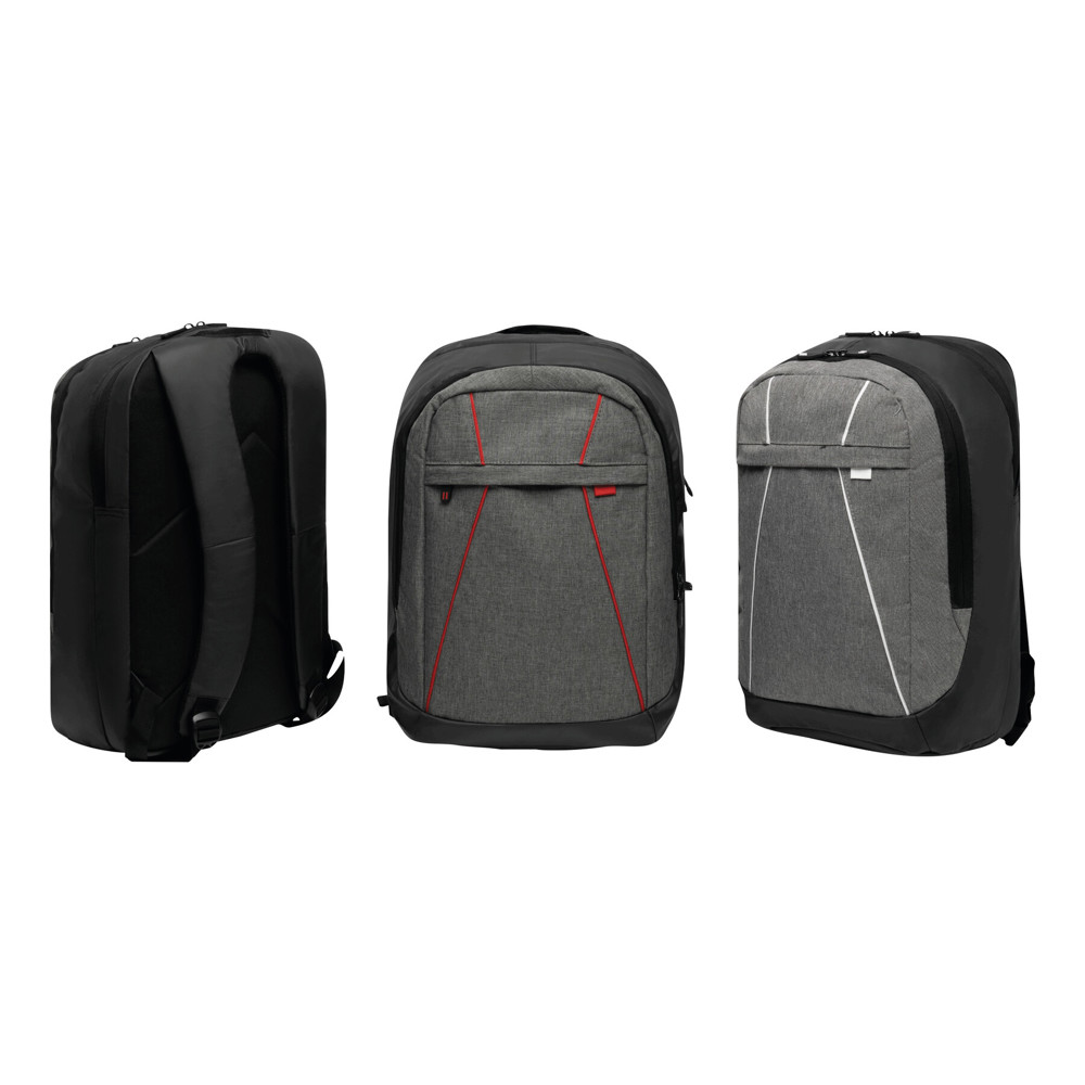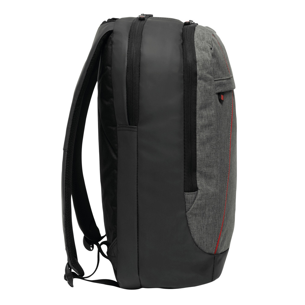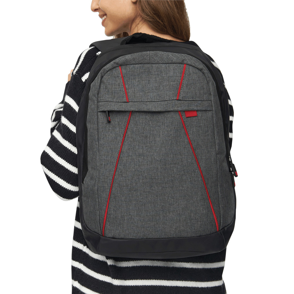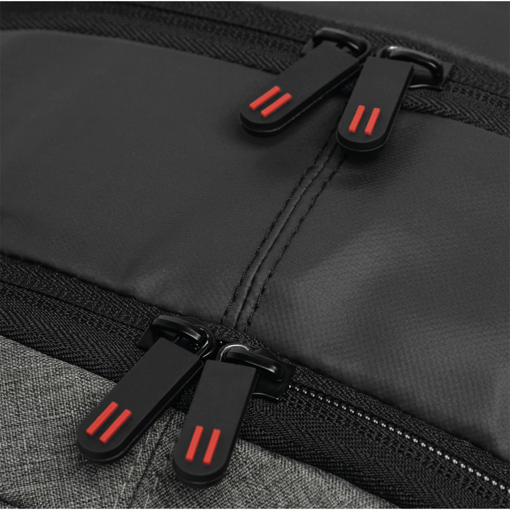 Backpack SPLIT: 1 zipped front pocket, 2 zipped main compartments, one main compartment with padded laptop pocket and 1 slip-in pocket, the other main compartment with small organiser, grab handle, padded shoulder straps and back panel
