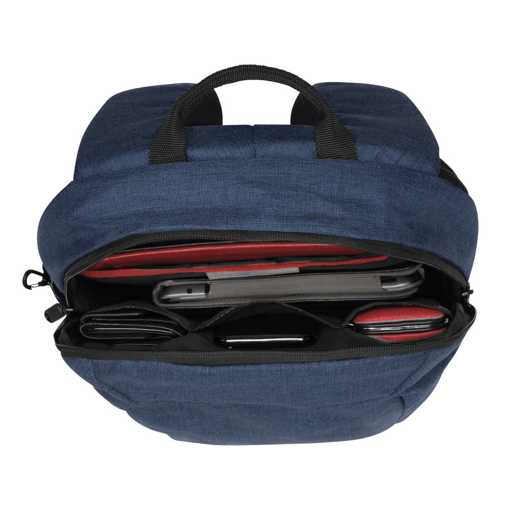 Backpack PROTECT: front compartment with vertical zip, 1 spacious main compartment with zip, laptop compartment, and 3 slip-in pockets, foldaway carabiner on the outside for securing zip against theft, grab handle, padded and ergonomic shoulder straps, padded back panel with security compartment