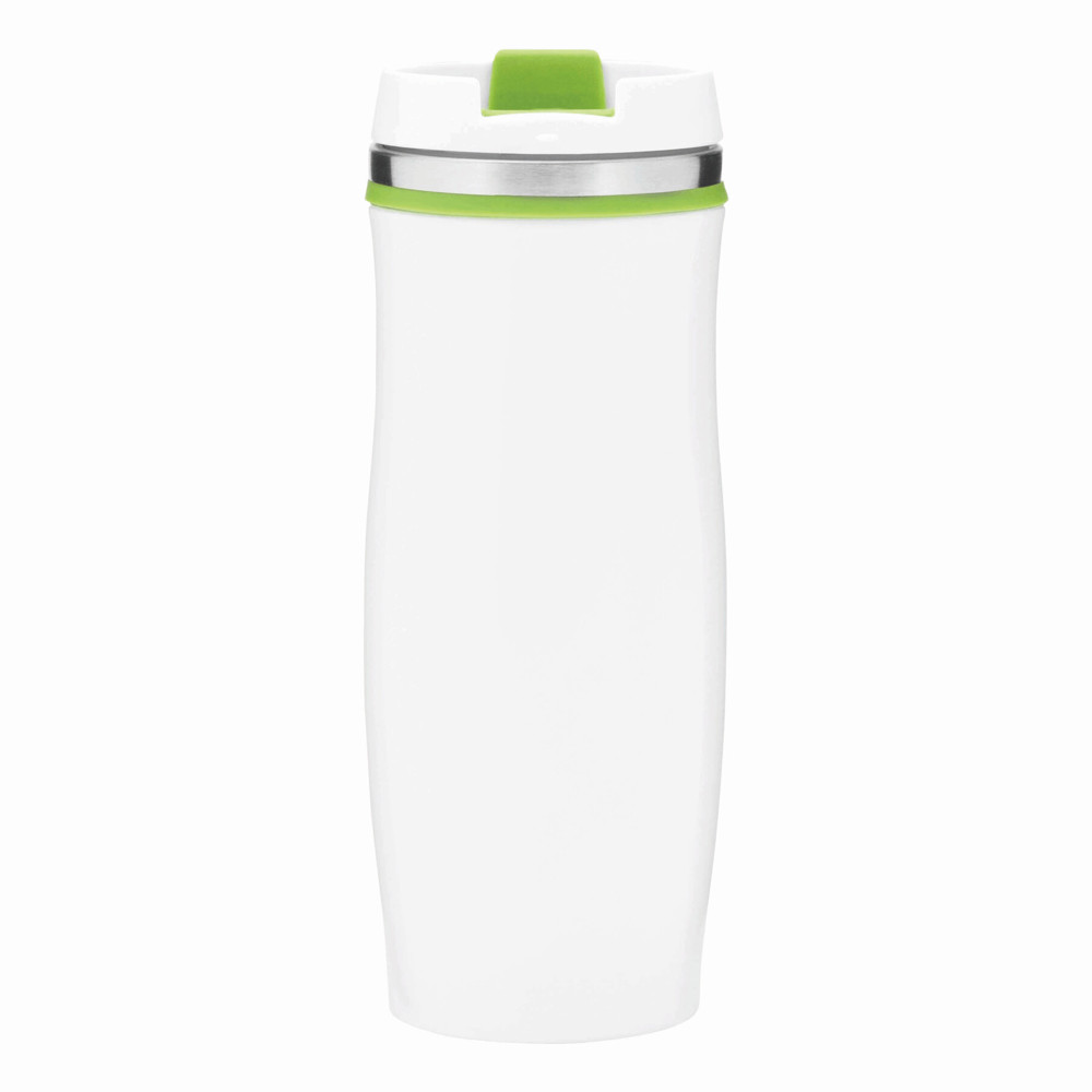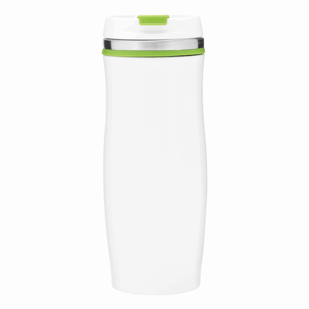 Double-walled travel mug CREMA: stainless steel on the inside and outside, with screwable plastic lid and integrated fold-out drinking opening, coloured rubber ring around the top and rubber bottom, approx. 400 ml capacity, in a box