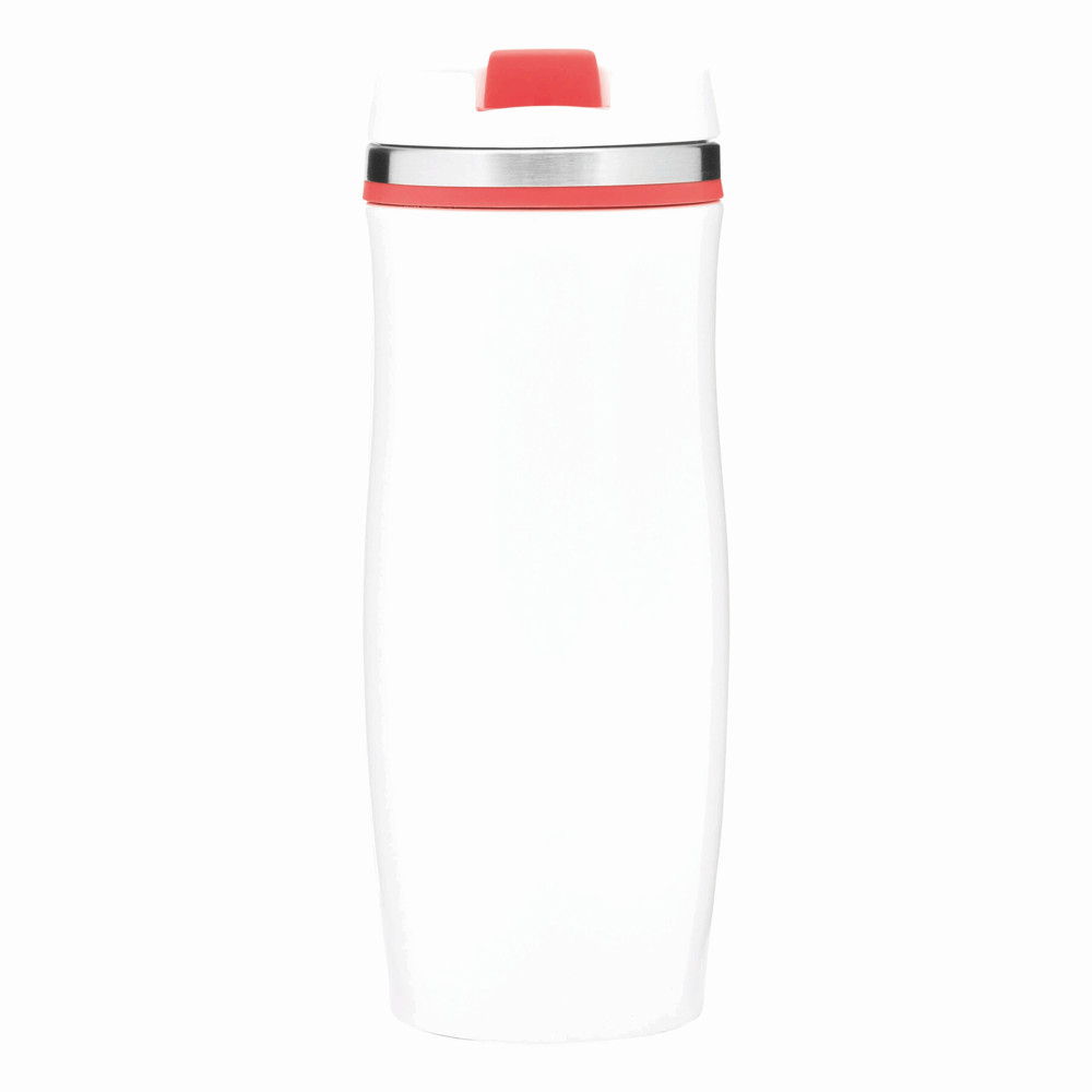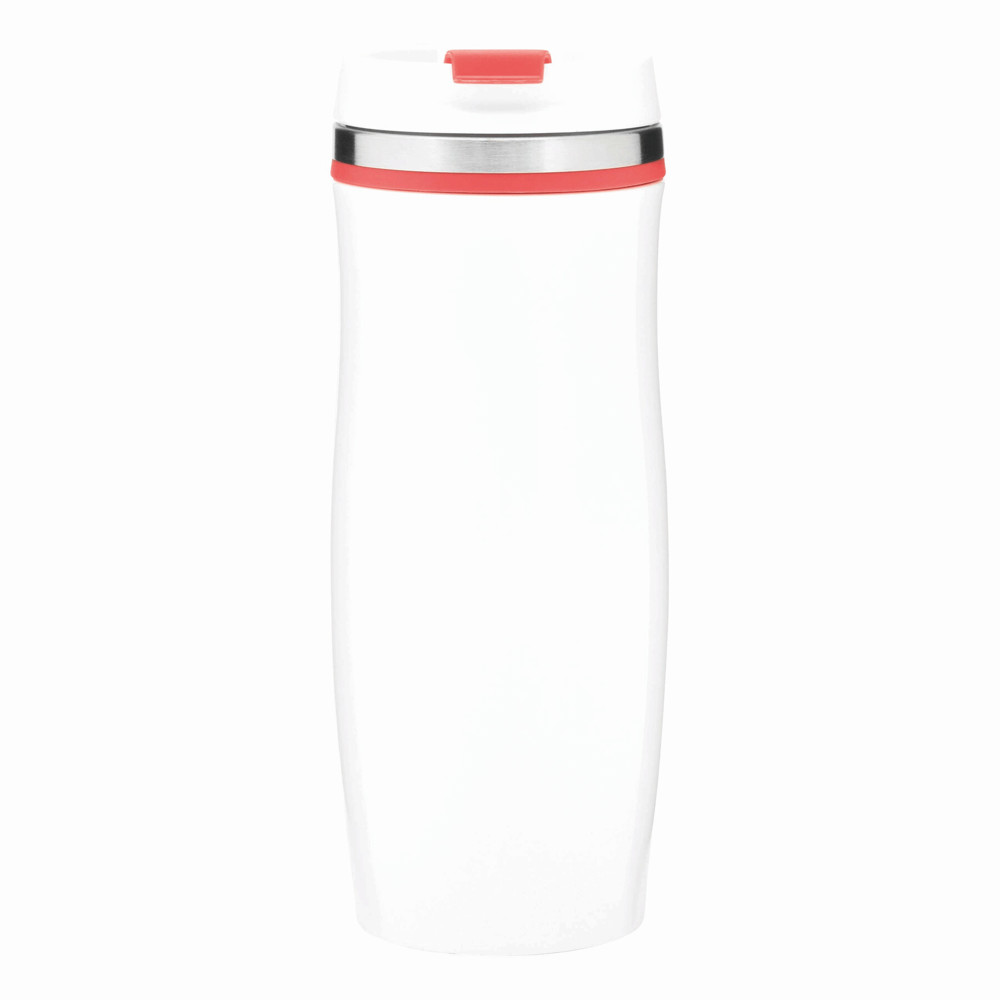 Double-walled travel mug CREMA: stainless steel on the inside and outside, with screwable plastic lid and integrated fold-out drinking opening, coloured rubber ring around the top and rubber bottom, approx. 400 ml capacity, in a box