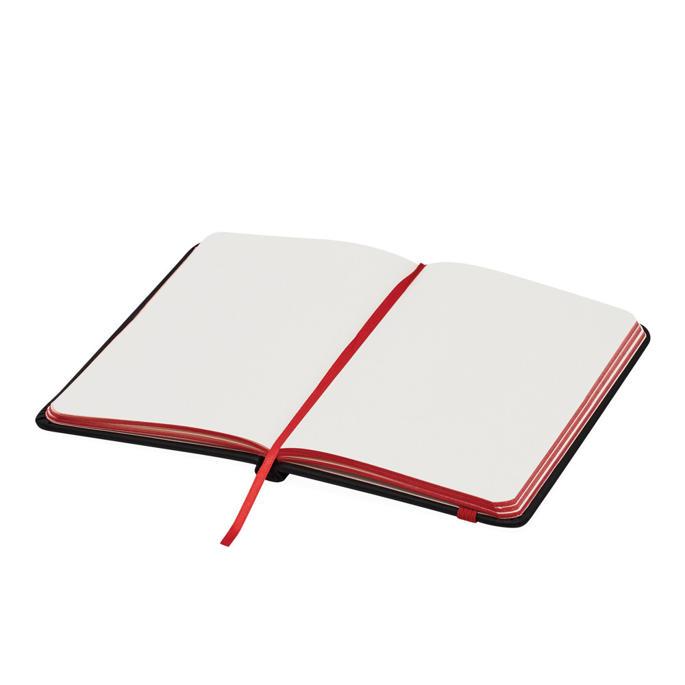 Notepad LECTOR in DIN A6 size with rounded off corners: coloured rubber band to close and coloured page margins, integrated bookmark, 80 sheets, blank, 70 g/m²
