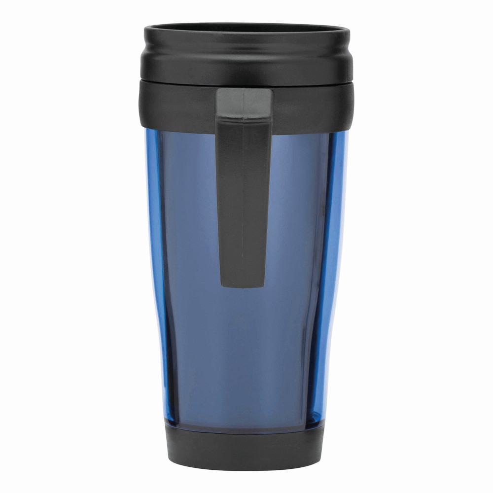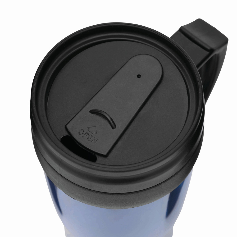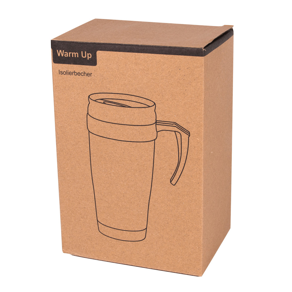 Double-walled travel mug WARM-UP: made of plastic on the inside and outside, with convenient handle, plastic lid and drink opening in the lid, approx. 400 ml capacity, in a box