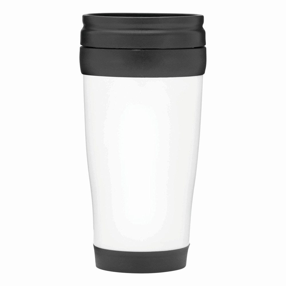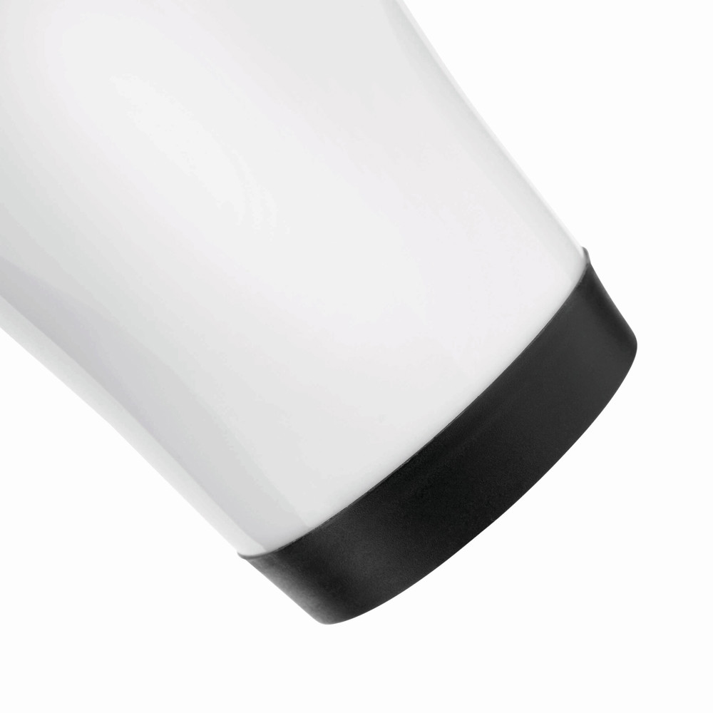 Double-walled travel mug WARM-UP: made of plastic on the inside and outside, with convenient handle, plastic lid and drink opening in the lid, approx. 400 ml capacity, in a box