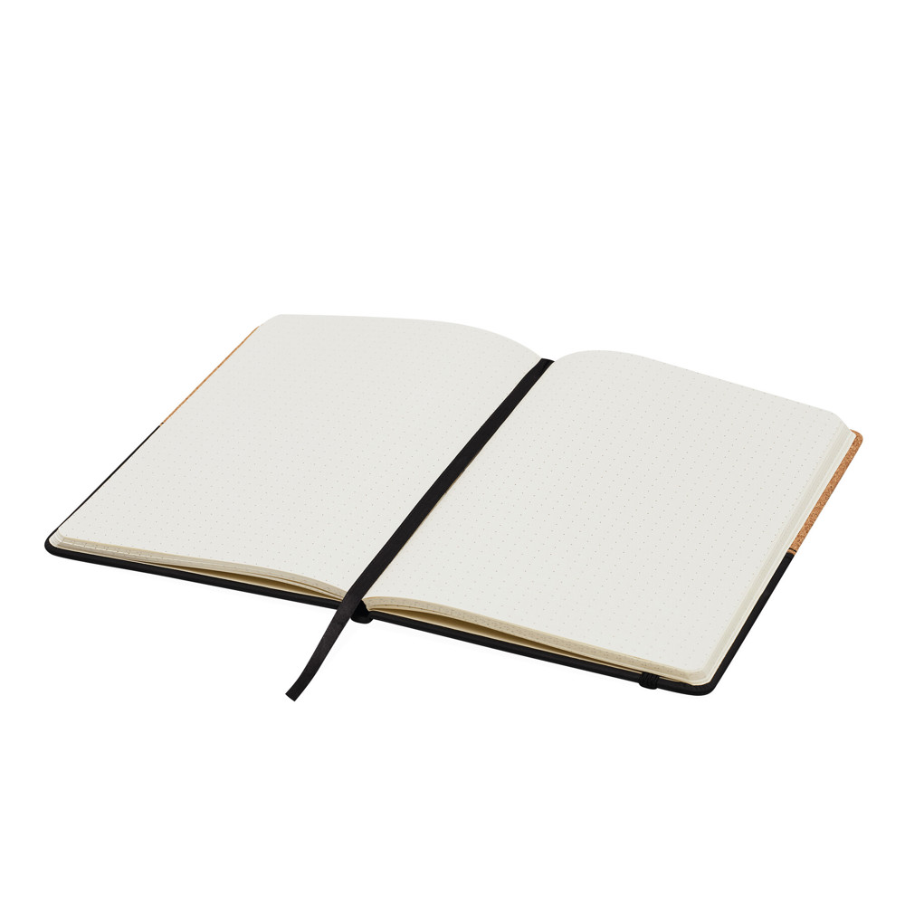 Notebook CORKY in DIN A5 size with rounded corners, rubber band to close, with integrated bookmark, 80 sheets, dotted paper, 70 g/m² – cork binding