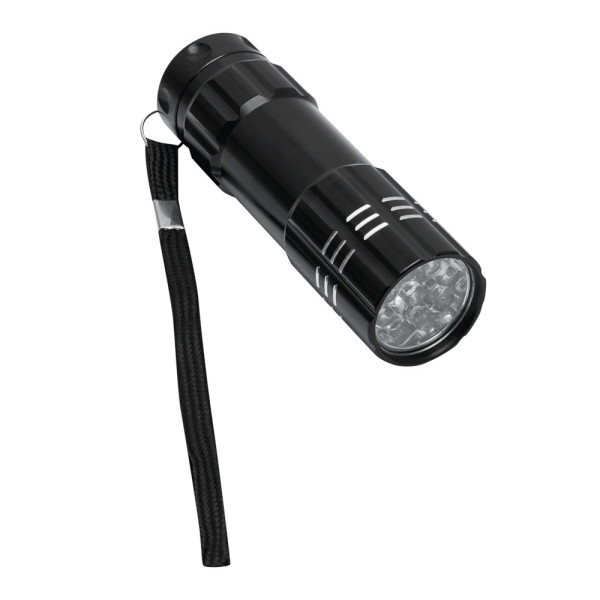 LED torch POWERFUL with 9 bright white LED lights, ON/OFF button, and a carrying loop, battery-operated (1 x AAA battery included), packed in a gift box