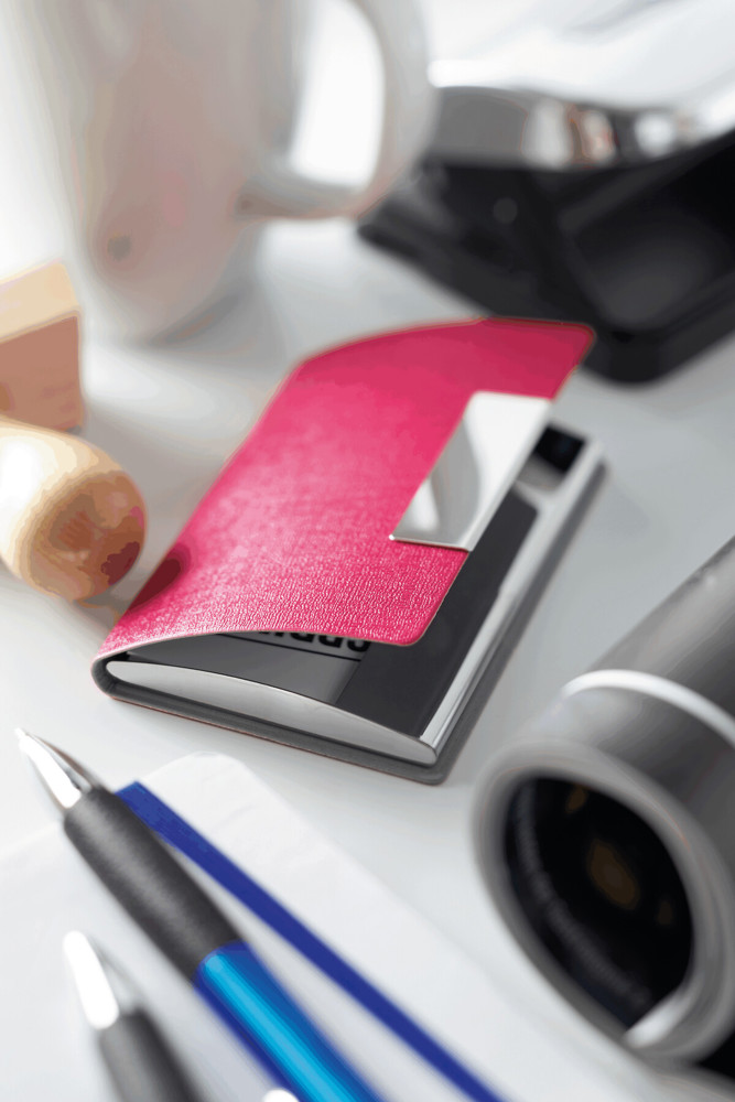 Business card holder ATLAS: with magnetic clasp and metal plate for advertisement more