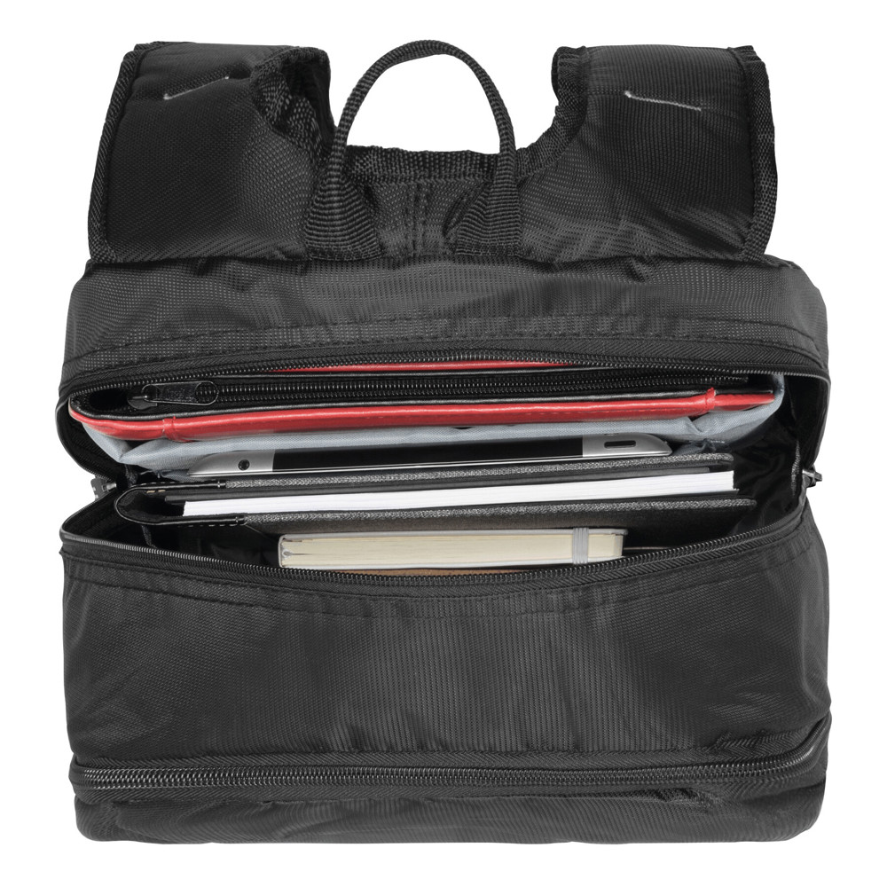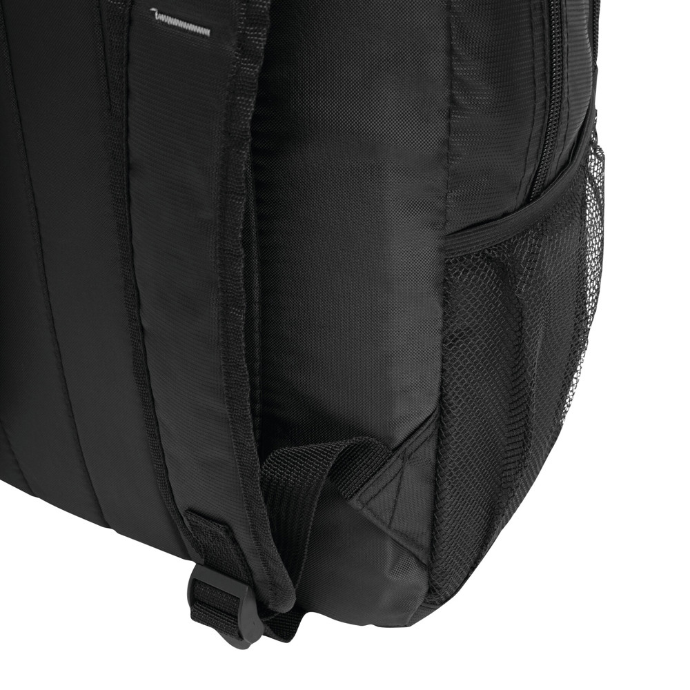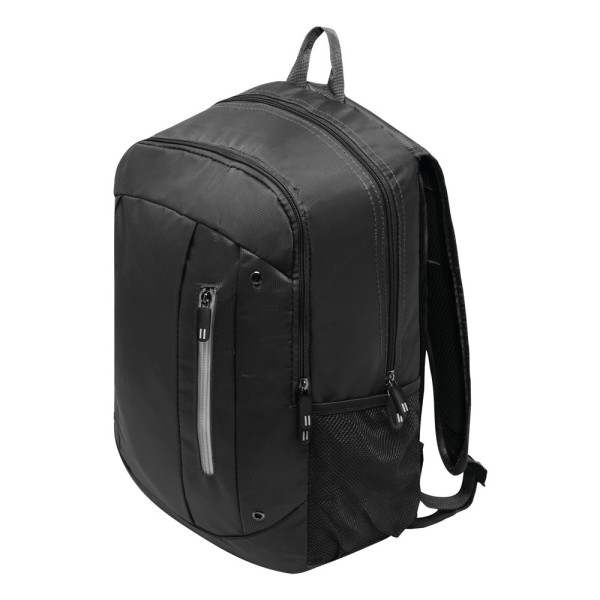 Backpack TALLINN: 1 zippered front pocket with organiser, small vertical front pocket with coloured zip, 1 zippered main compartment with padded interior compartment for laptop or tablet plus additional slip-in pocket, 2 mesh pockets on the side, carrying handle, padded shoulder straps and back support