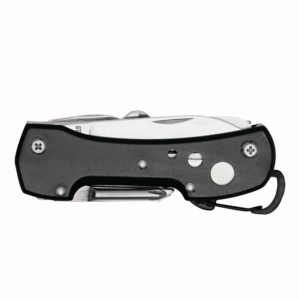 12-piece pocket knife STRONG HELPER: with knife, saw, scissors, can opener, cork screw, bottle opener and slotted screwdriver, Phillips screwdriver, punch and reamer, sewing awl, scaler, nail file, and carabiner