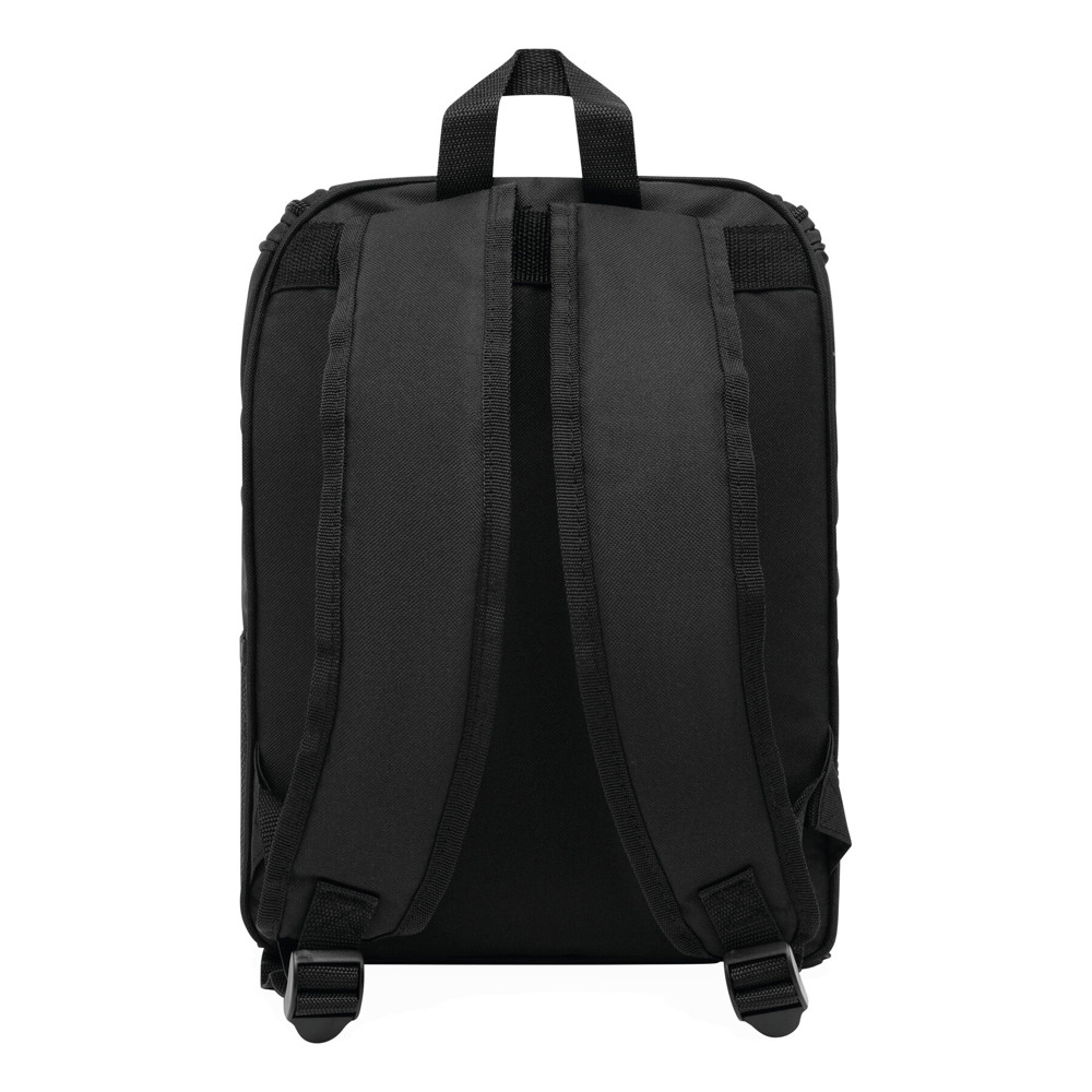 Picnic backpack OUTSIDE for 2 people: with an insulated main pocket, front pocket with plastic-handled cutlery, 2 plastic plates and glasses, 2 cloth napkins, 2 mesh pockets on the sides, grab handle, and padded shoulder straps