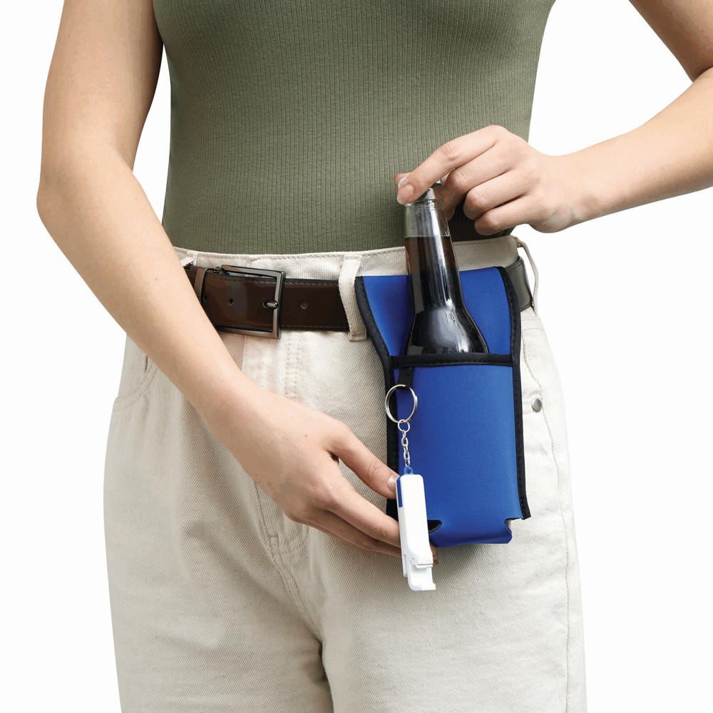 Bottle holder COOL HIKING in neoprene design: suitable for bottles and cans with a diameter of approx. 7 cm – with Velcro fastener to attach to belt, handlebar, and stroller, extra loop for a bottle opener (excluded) or key, sleeve with exposed advertising area