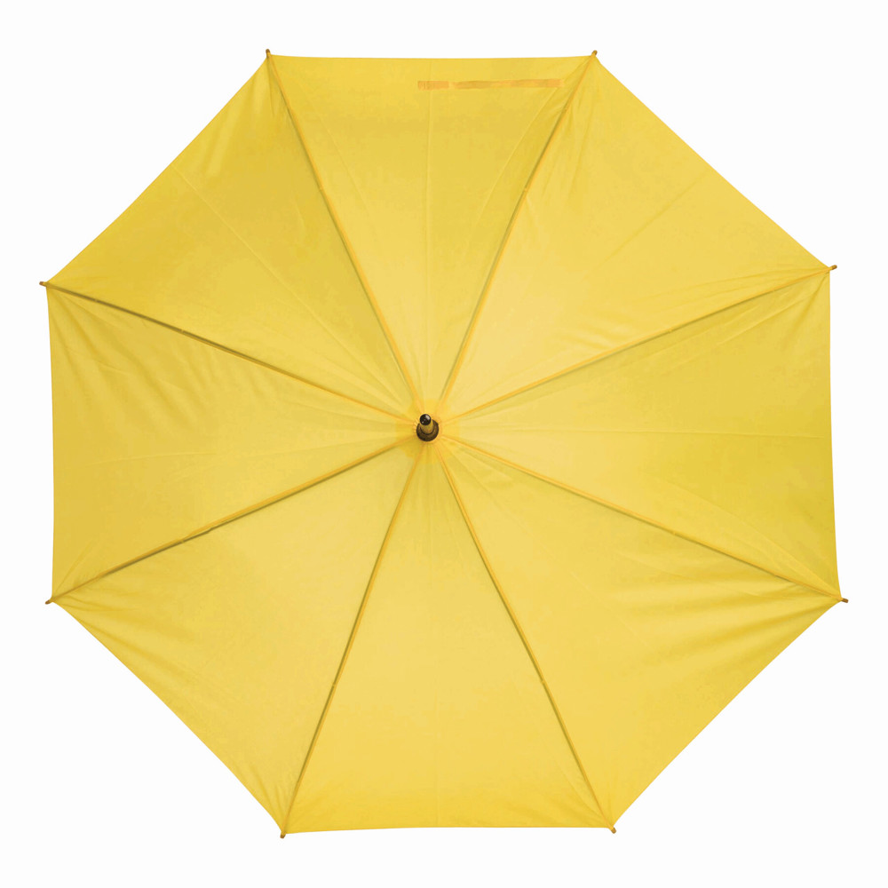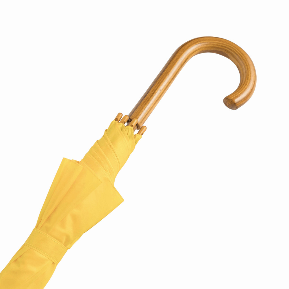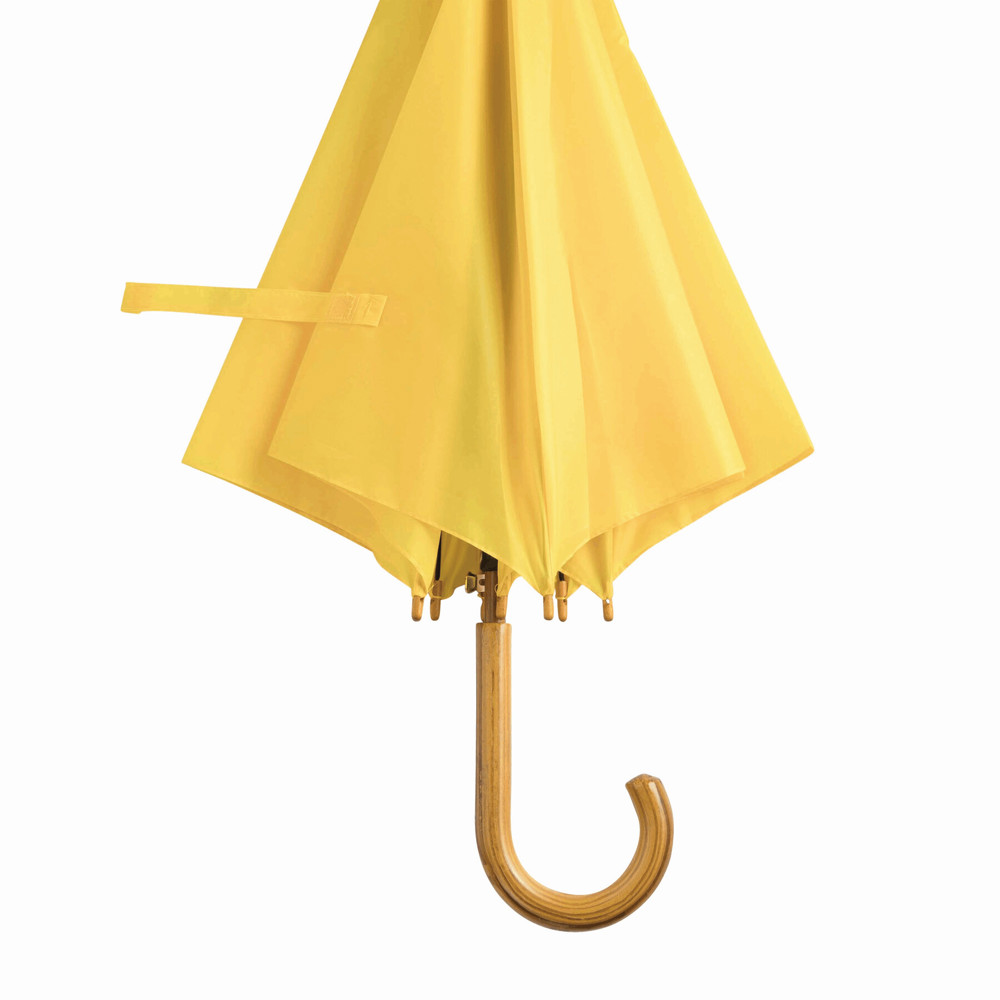 Automatic wooden stick umbrella TANGO: with metal ribs, wooden tips, wooden crook handle, polyester canopy, closing strap with touch fastener