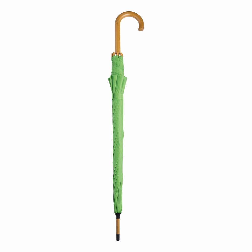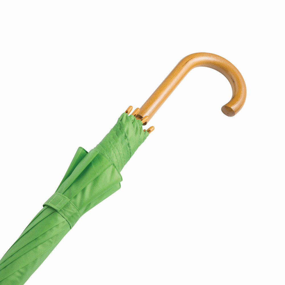 Automatic wooden stick umbrella TANGO: with metal ribs, wooden tips, wooden crook handle, polyester canopy, closing strap with touch fastener