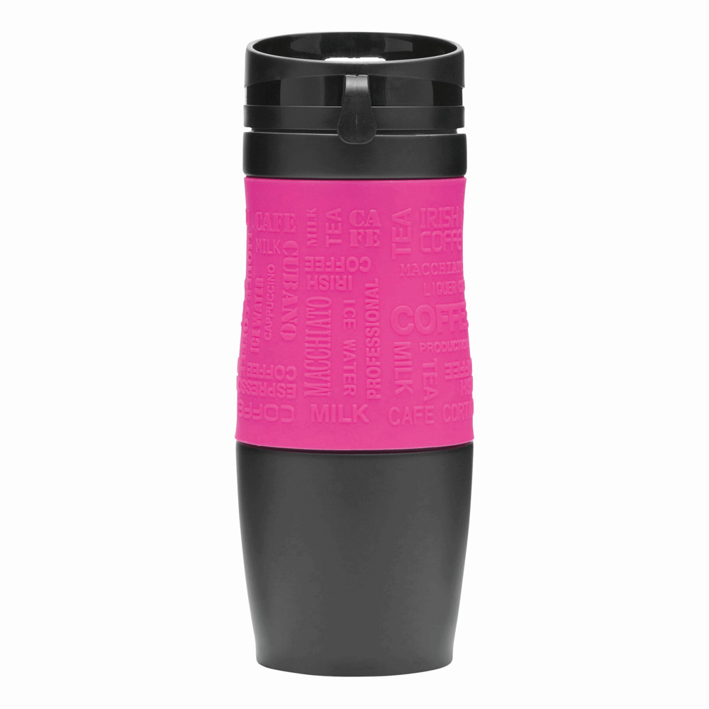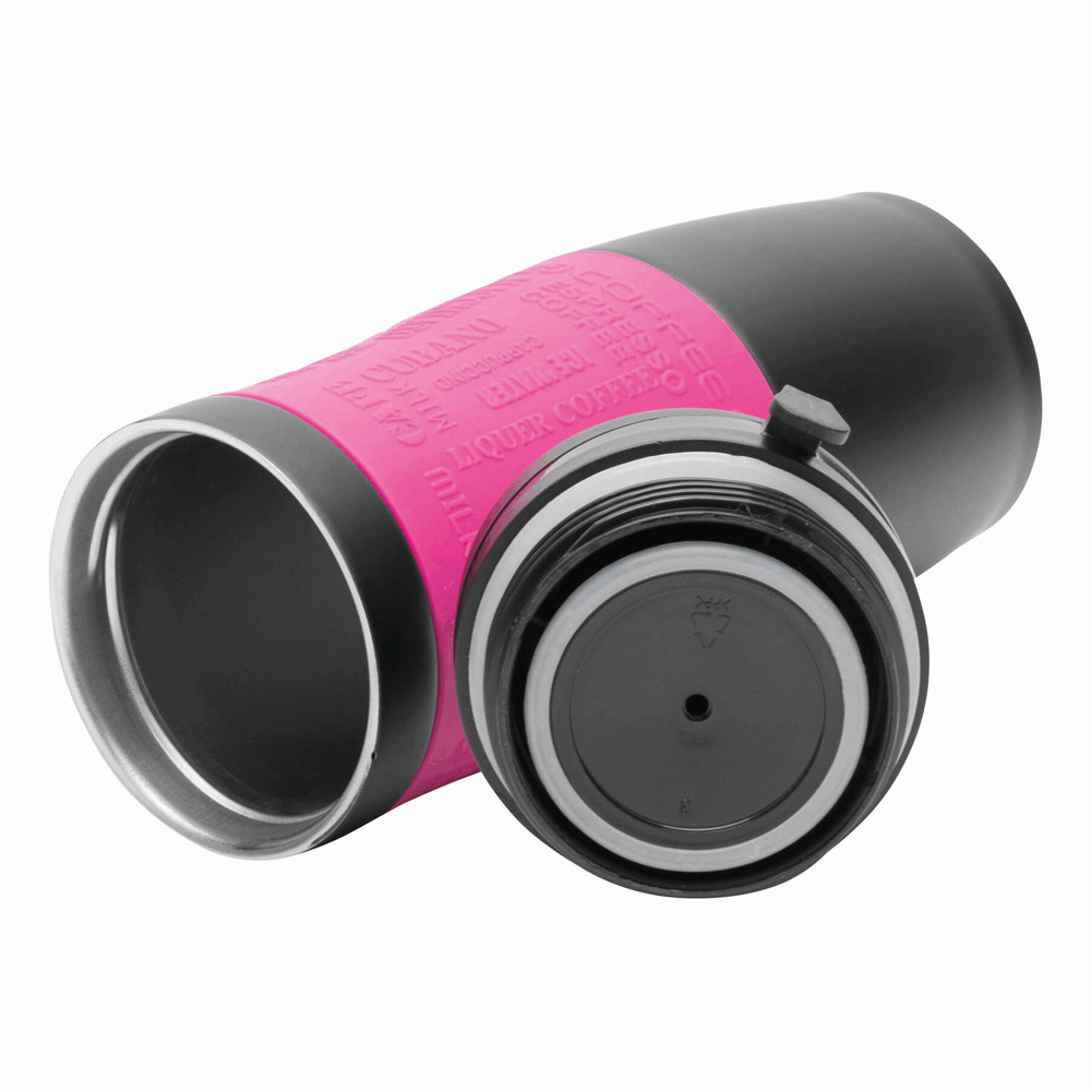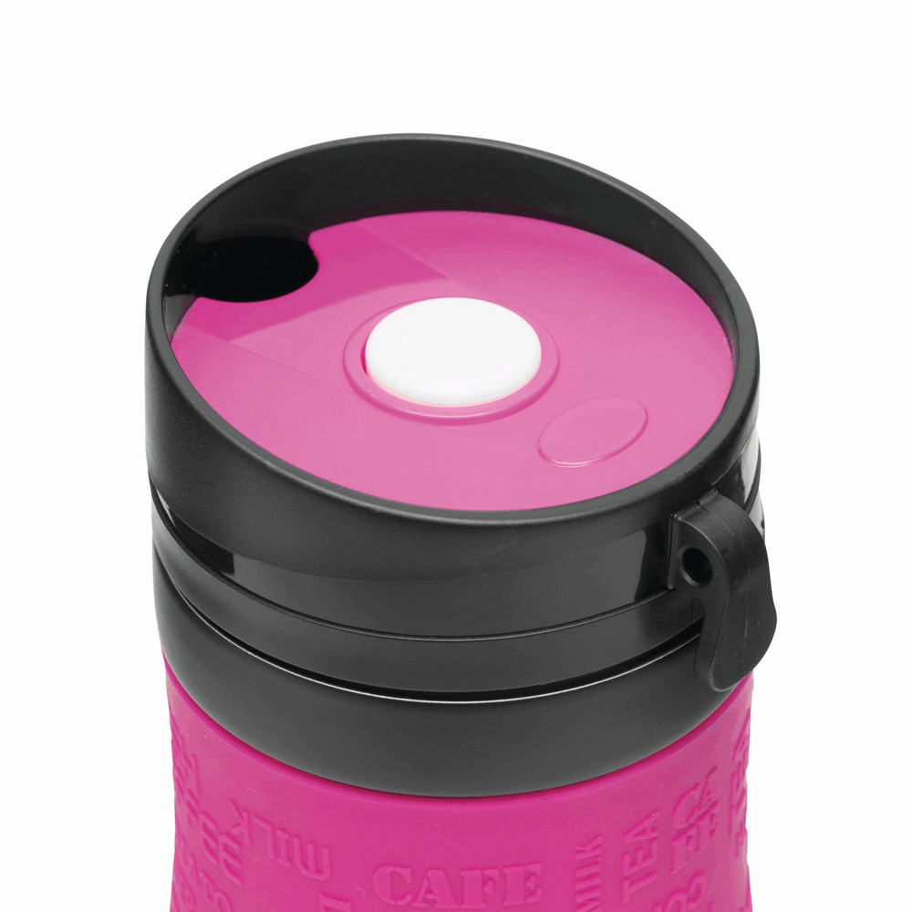 Double-walled travel mug GOLDEN DREAM: inside and outside made of stainless steel, plastic lid with secure screwable lid, push OPEN/CLOSE button and integrated drinking opening – hook on the outside to attach the lid, coloured rubber-coated silicone sleeve for a better grip, approx. 380 ml capacity, in gift box