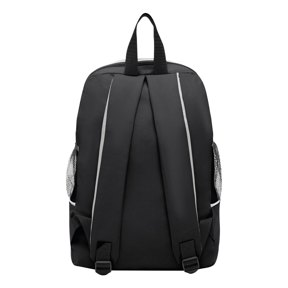 Backpack TEC: front pocket with zip and earphone hole, zippered main compartment, carrying strap, 2 mesh pockets on the side, padded shoulder straps