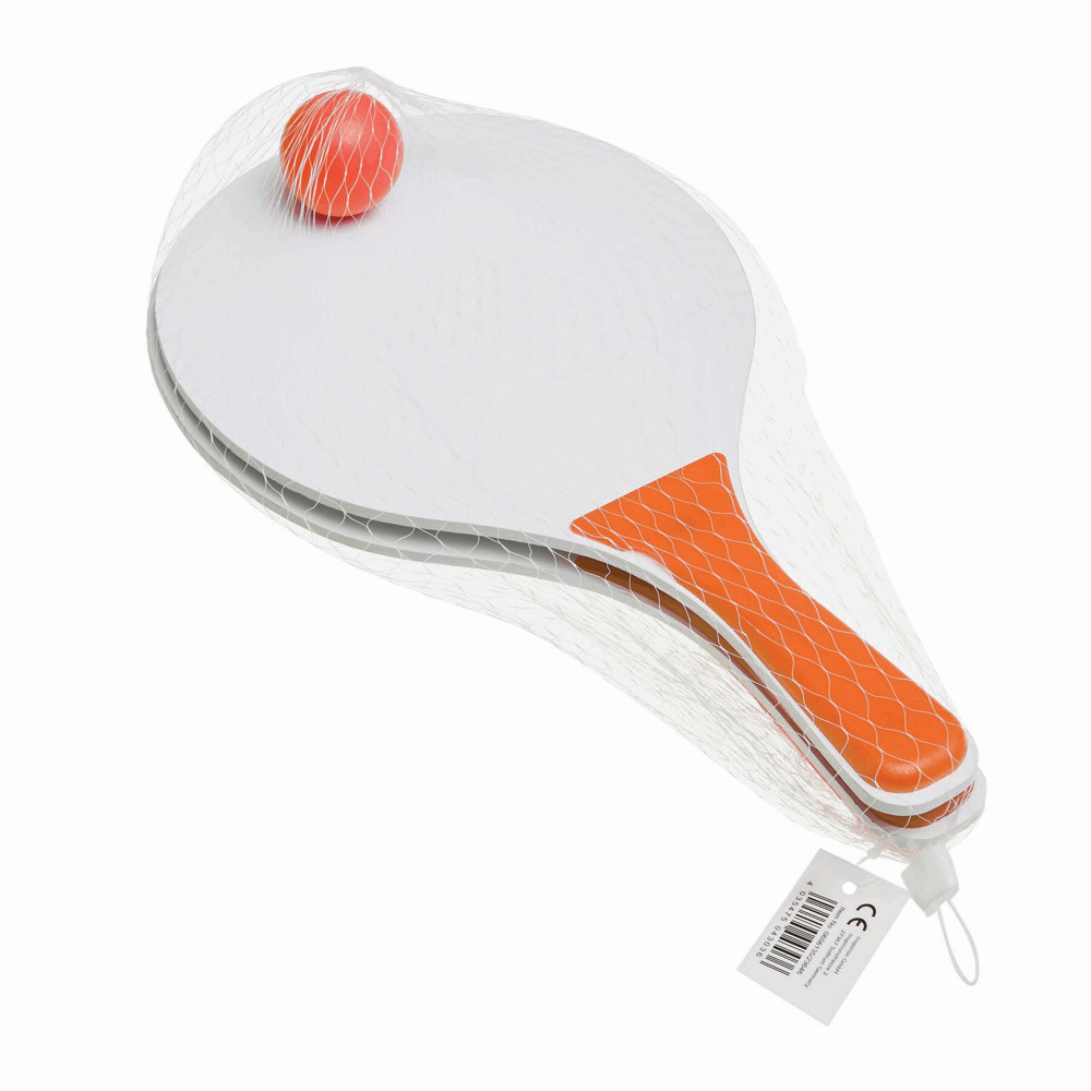Beach ball set SUMMER FEELING with 2 wooden bats with coloured handles, 1 softball, packed in a net bag