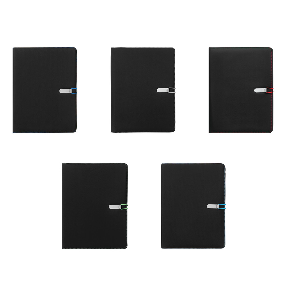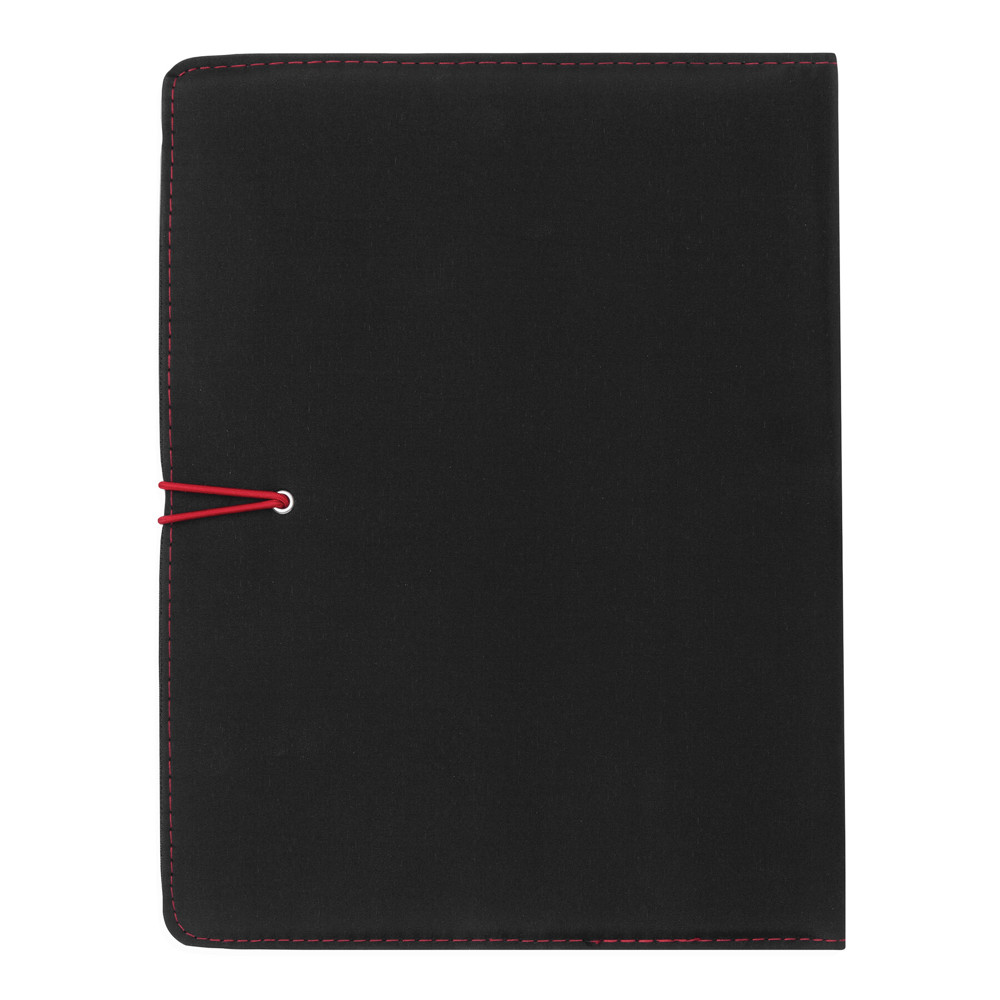 Portfolio SESSION in DIN A4 format, includes writing pad, loop for writing utensil, various slip-in pockets, metal hook with coloured elastic band for closing