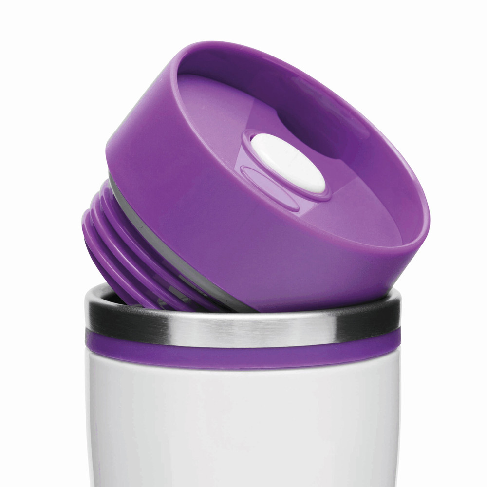 Double-walled travel mug ARABICA: made of stainless steel on the inside and outside, coloured plastic lid with a secure screw cap, OPEN/CLOSE push button, and integrated drinking opening, coloured rubber sleeve for a better grip, and rubberised stand for good surface adhesion, approx. 400 ml capacity, in a box