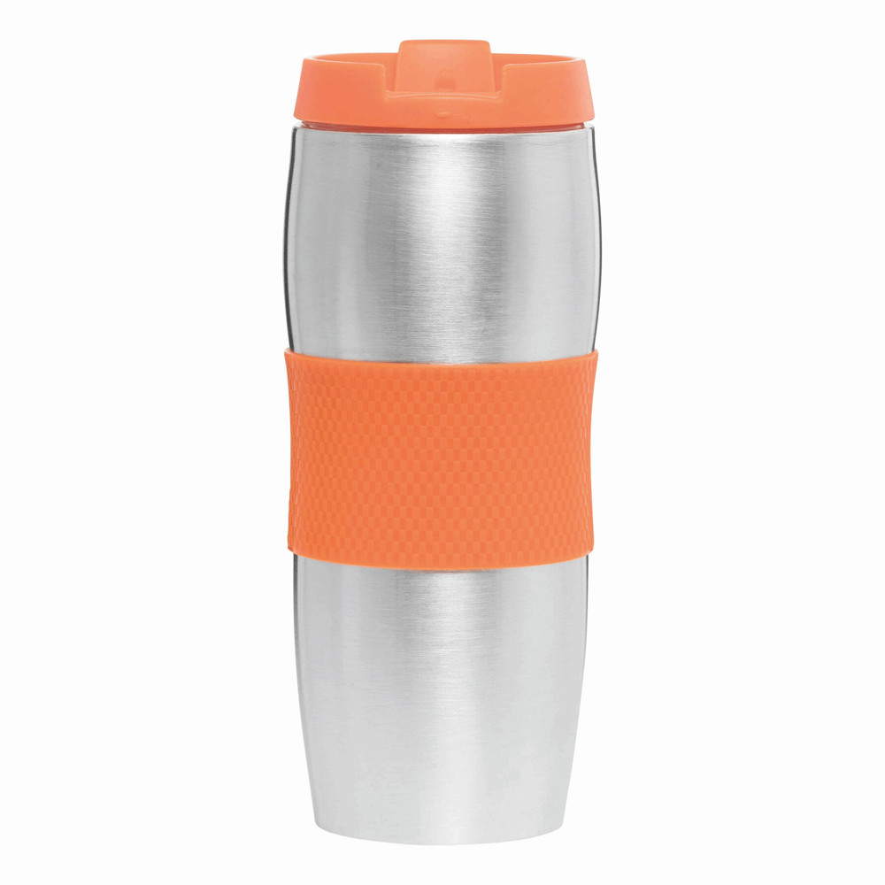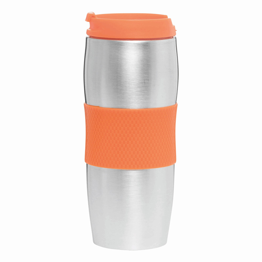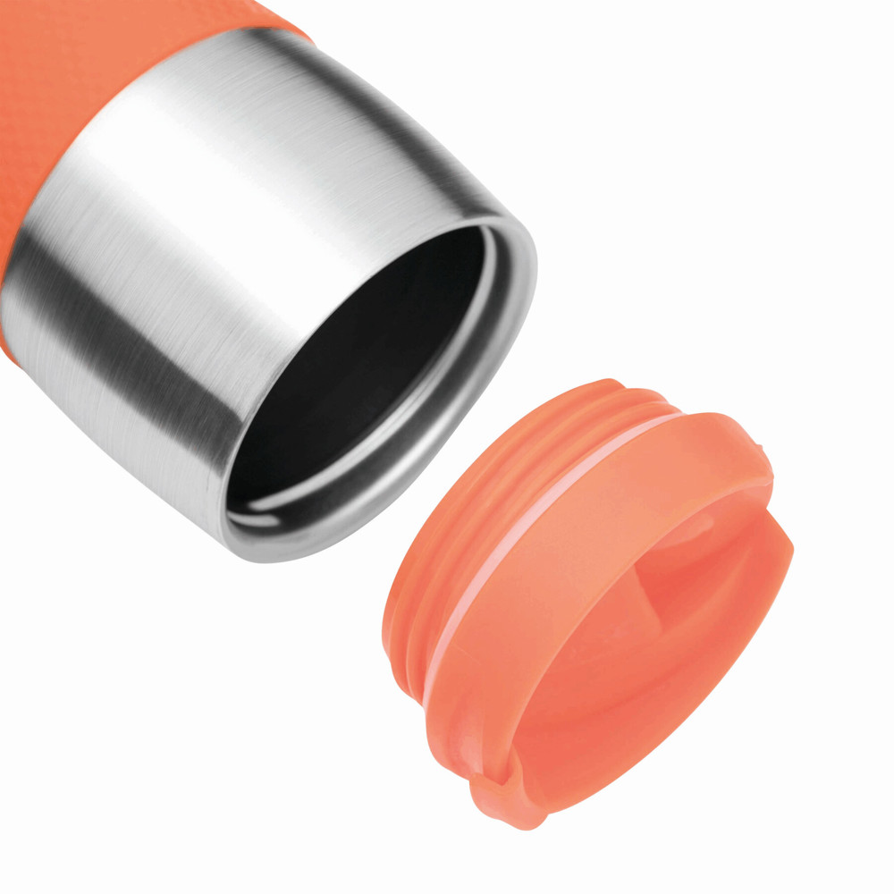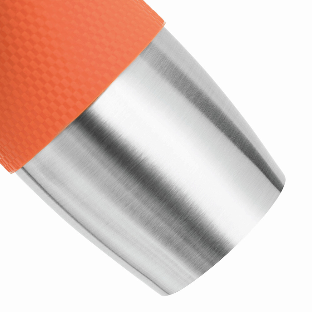 Doubled-walled travel mug AU LAIT: made of stainless steel on the inside and outside, coloured plastic lid with a secure screw cap and drinking opening, coloured rubber sleeve for a better grip, rubberised stand for good surface adhesion, approx. 380 ml capacity