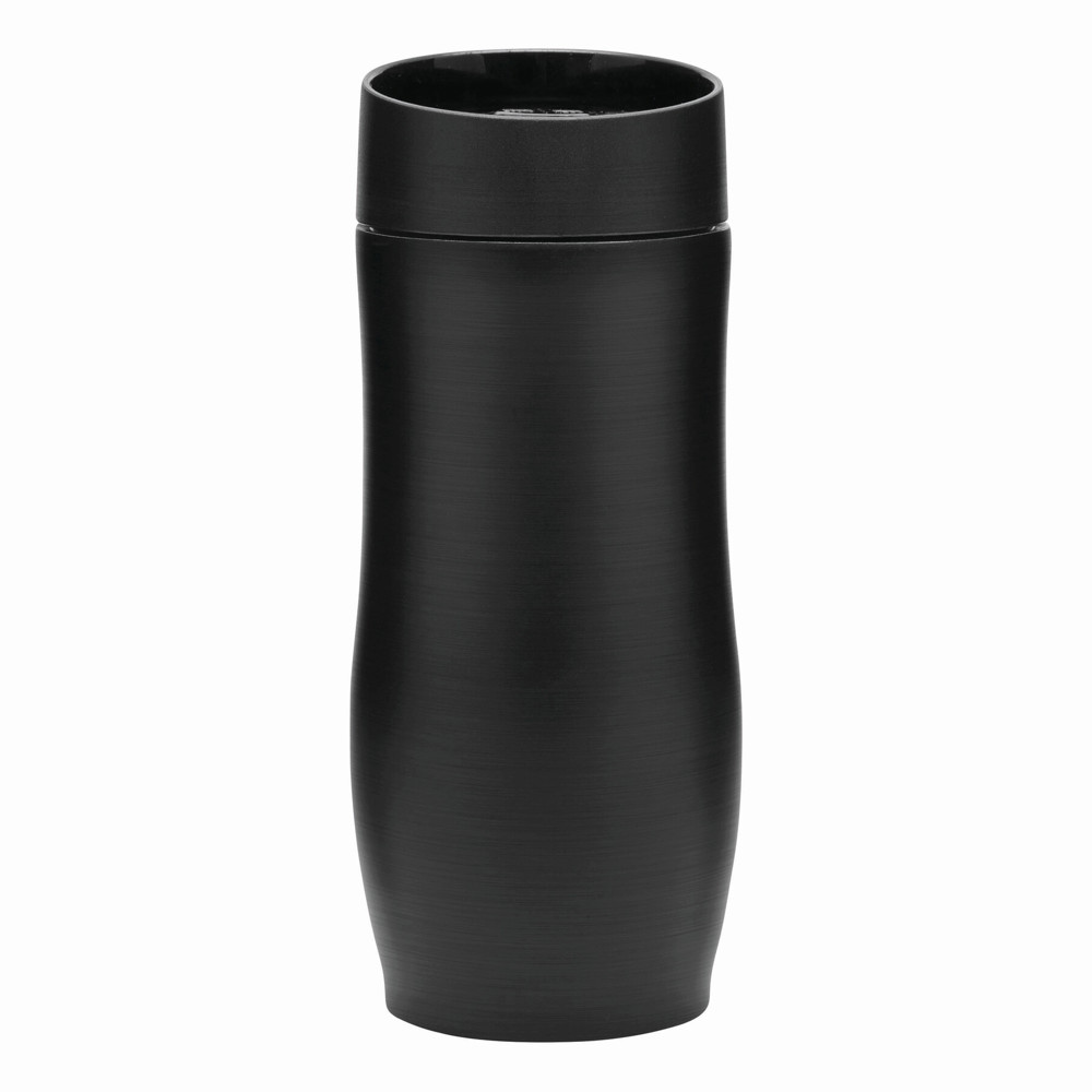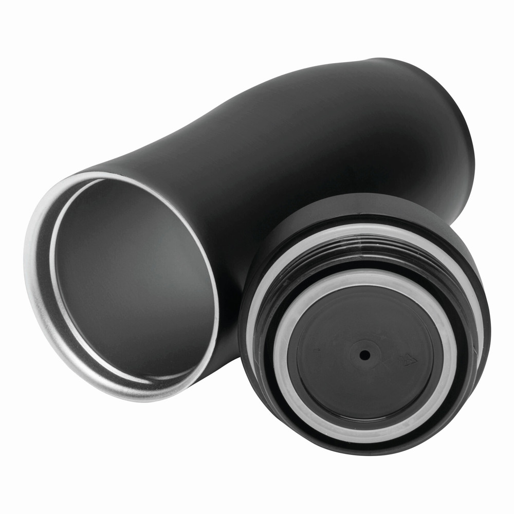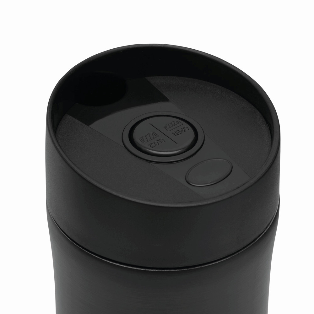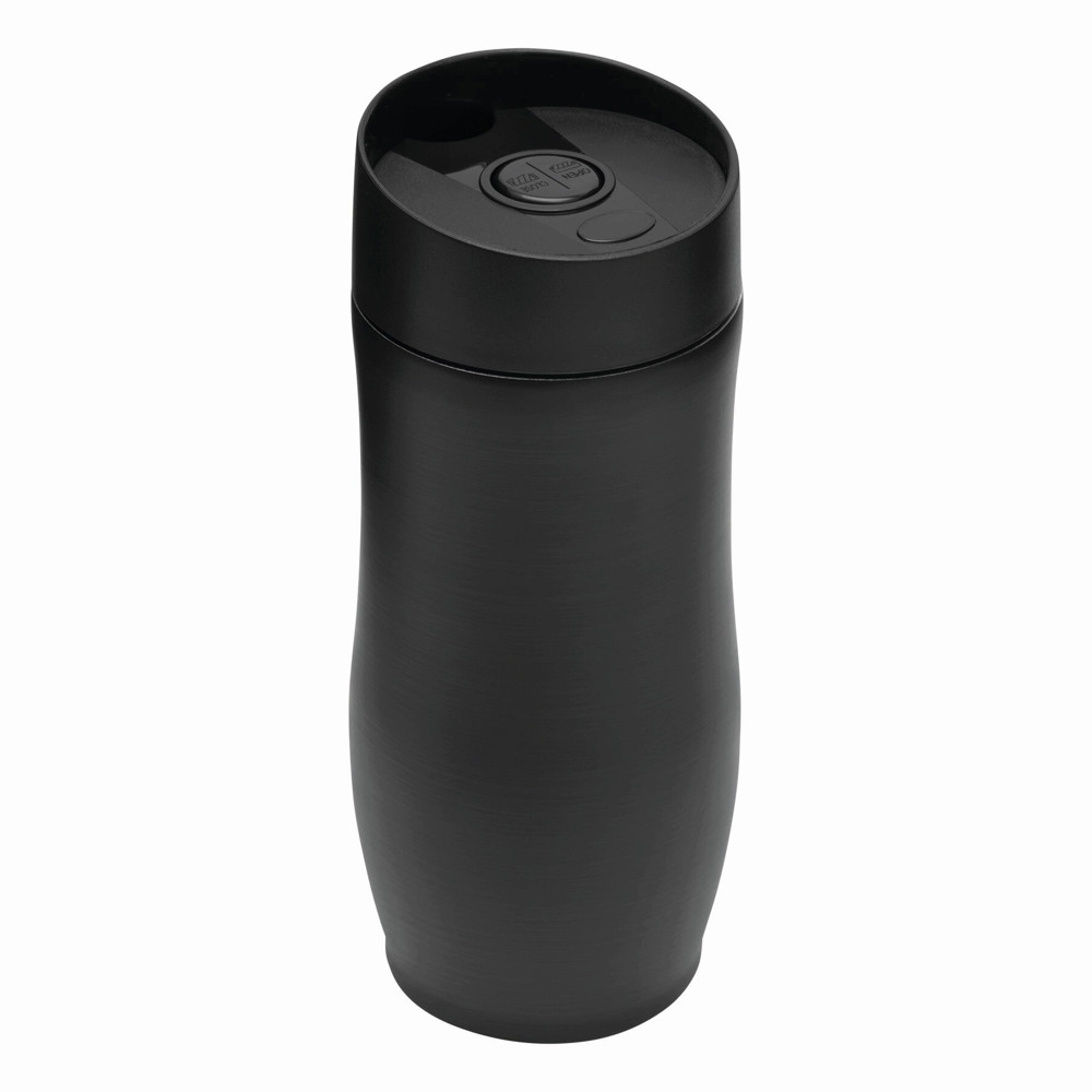 Double-walled mug CLASSICO: inside and outside made of stainless steel, plastic lid with secure screw cap, push button OPEN/CLOSE and integrated drinking opening, rubber-coated bottom for good adhesion, capacity approx. 380 ml