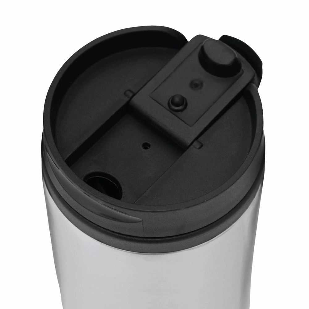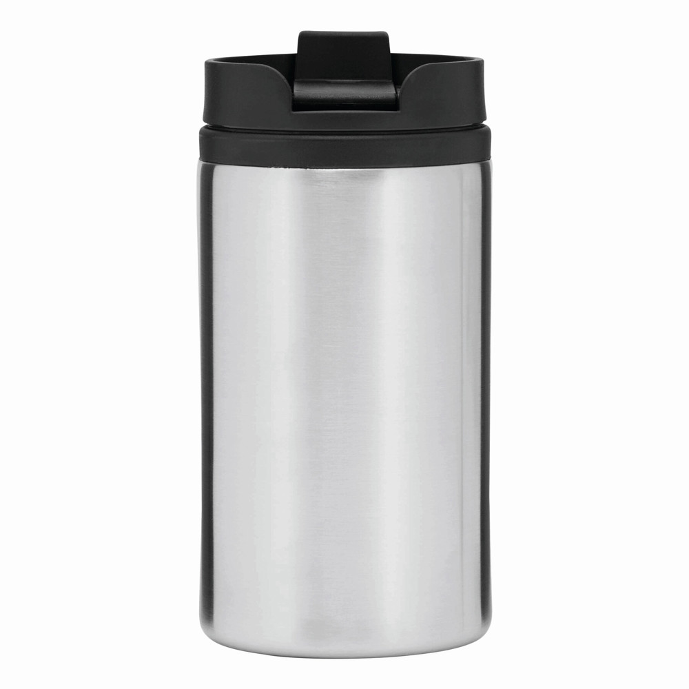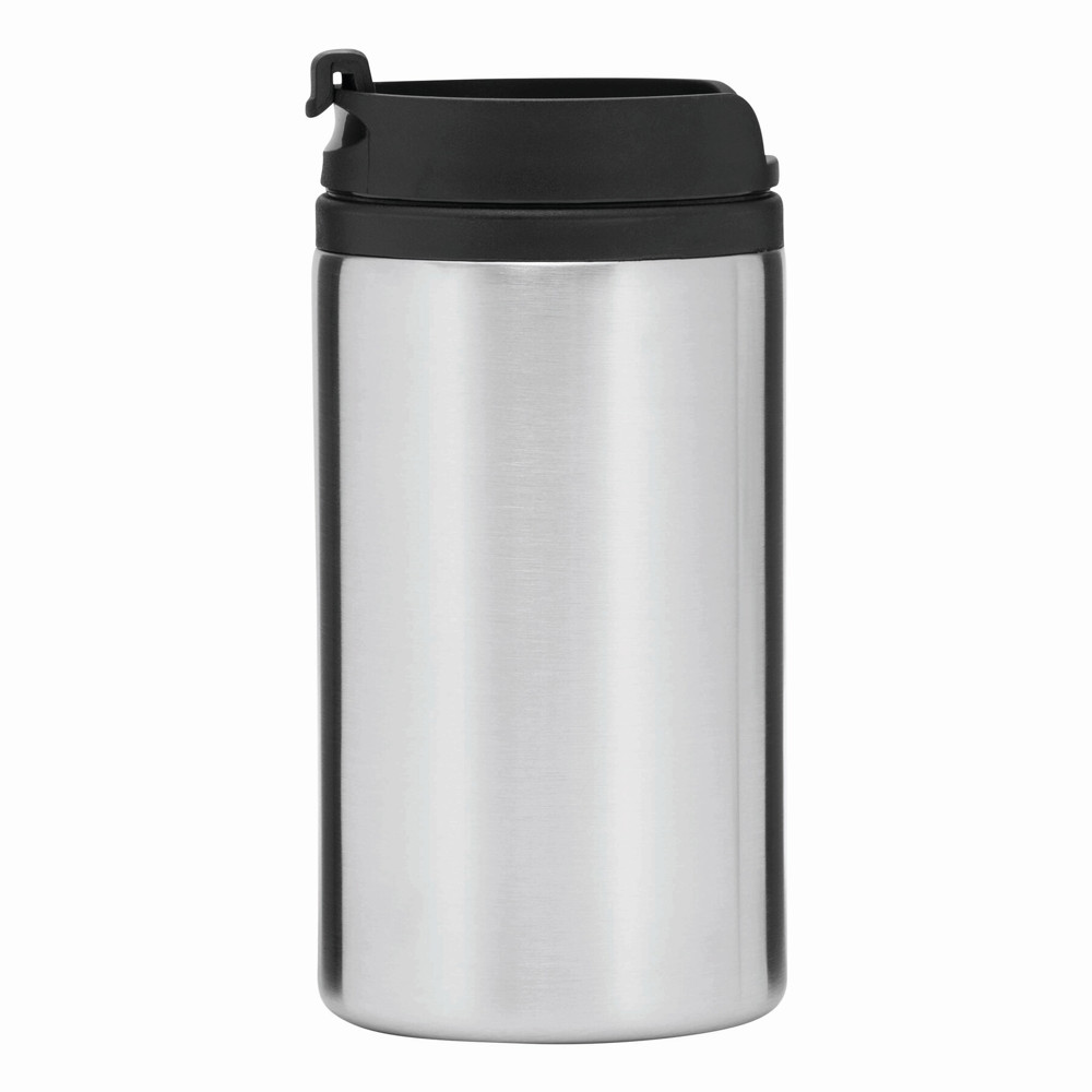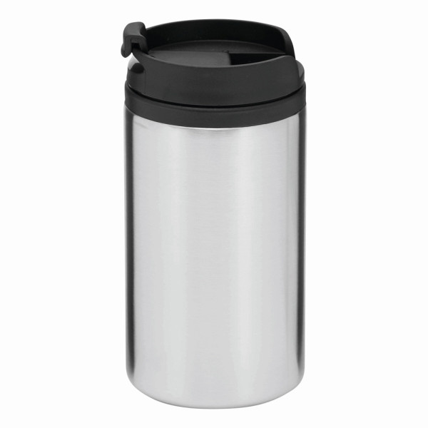 Travel mug TAKE FAST, double-walled: outside made of stainless steel, inside made of plastic, plastic lid with secure screw cap and integrated drinking opening, rubber-coated bottom for good adhesion, capacity approx. 290 ml, in a box
