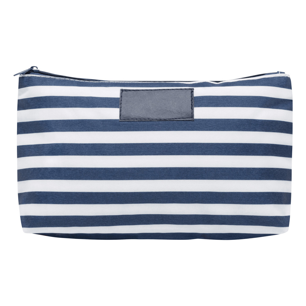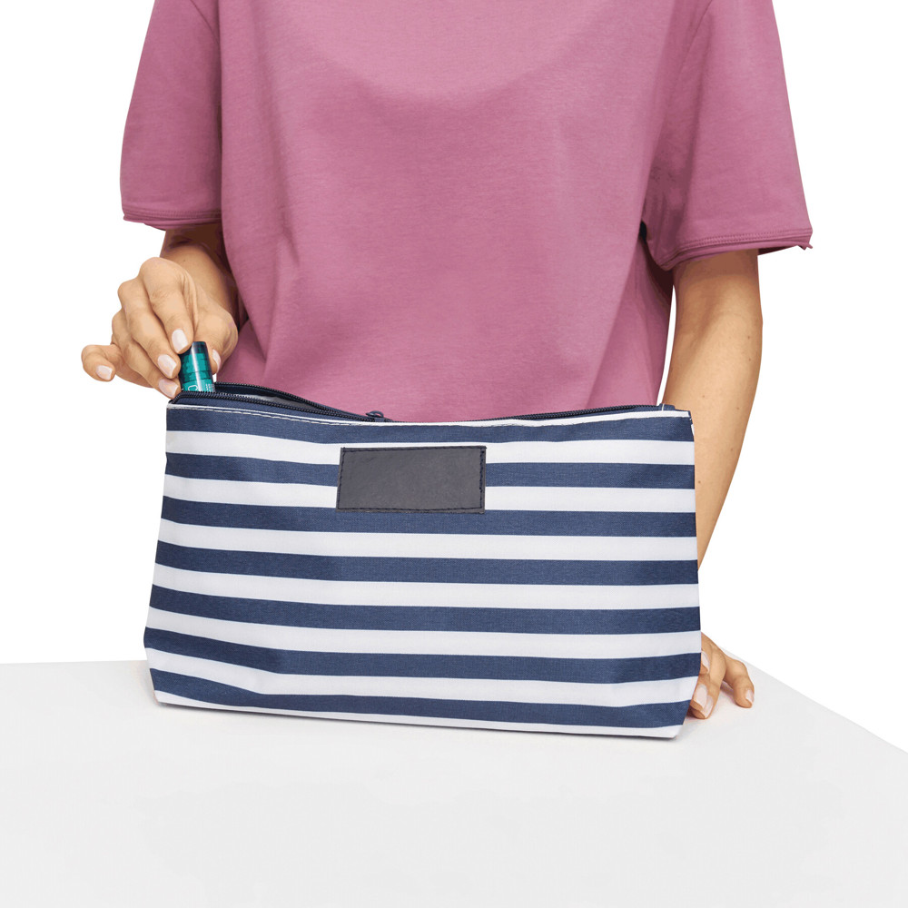 Toilet bag STRIPY: main compartment with zip, small zippered pocket inside, cosmetic bag outside in maritime stripes and with leatherette patch on the front for placement of advertisement – ideal for cosmetics and beauty products