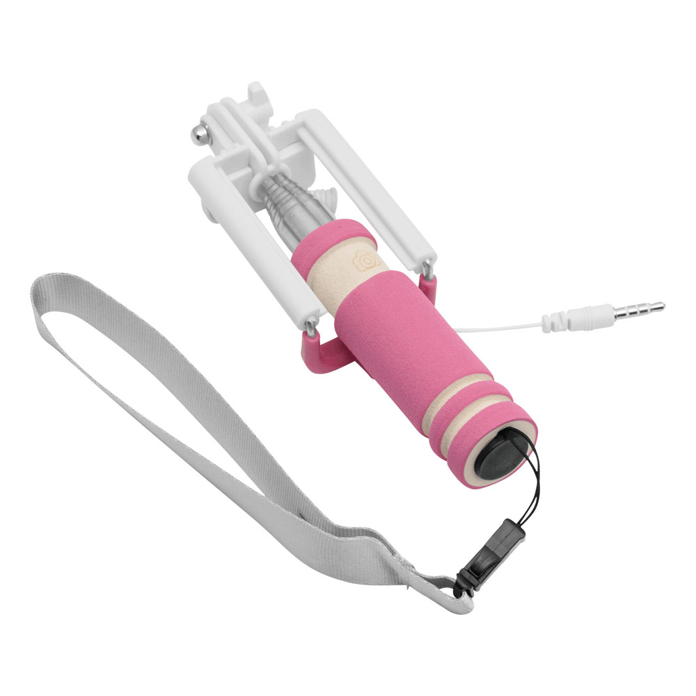 Telescopic selfie stick SELFIE MINI – useful for taking self-portraits with smartphones up to 8,5 cm width: integrated cable can be attached to audio output jack of phone, trigger button on handle, compatible with ANDROID 4.1.2 and iOS 5.0 and newer (depending on configuration), with other models camera trigger function can be activated via photo app, telescopic rod extendable from approx. 23 cm to approx. 61 cm, holder with angle of inclination up to approx. 270 degrees, coloured foam rubber handle with printable and detachable wrist strap