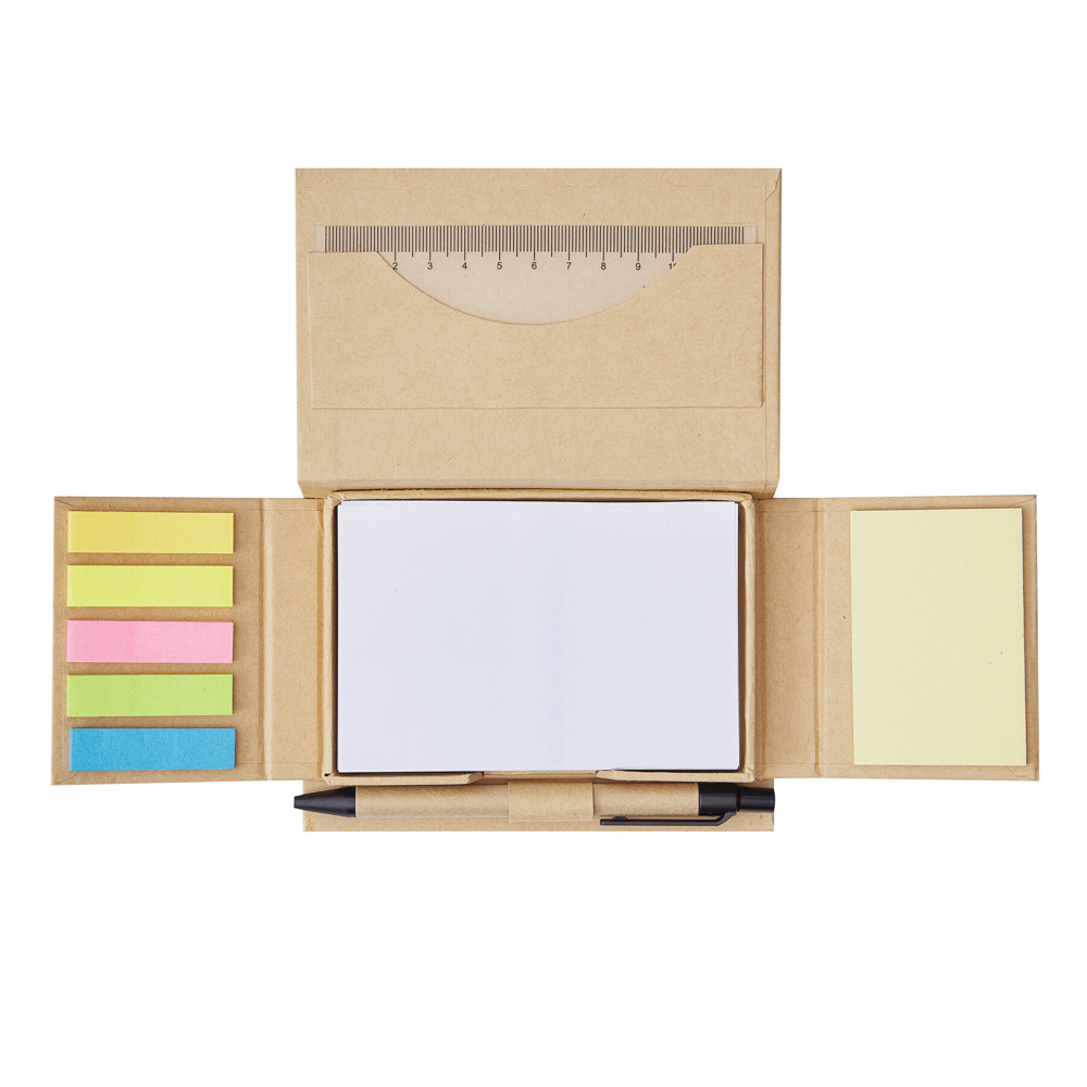 Memo box POP UP to fold out: includes ballpoint pen made of robust paper (black ink), ruler (12 cm), 100 white sheets, differently coloured page markers – made of recyclable materials