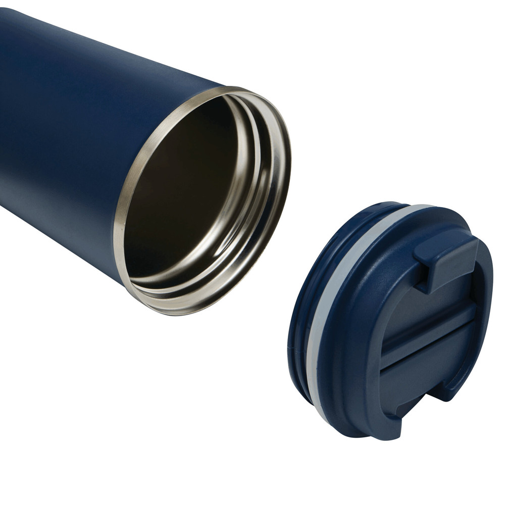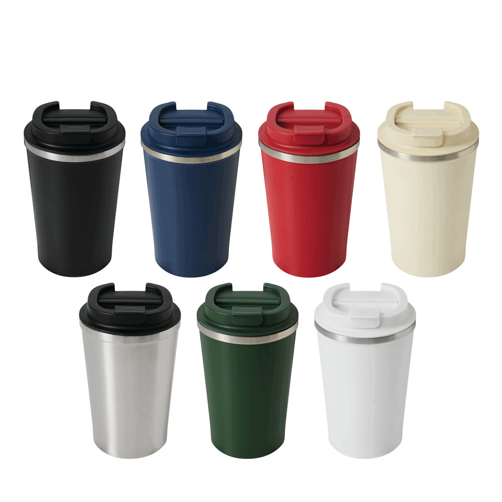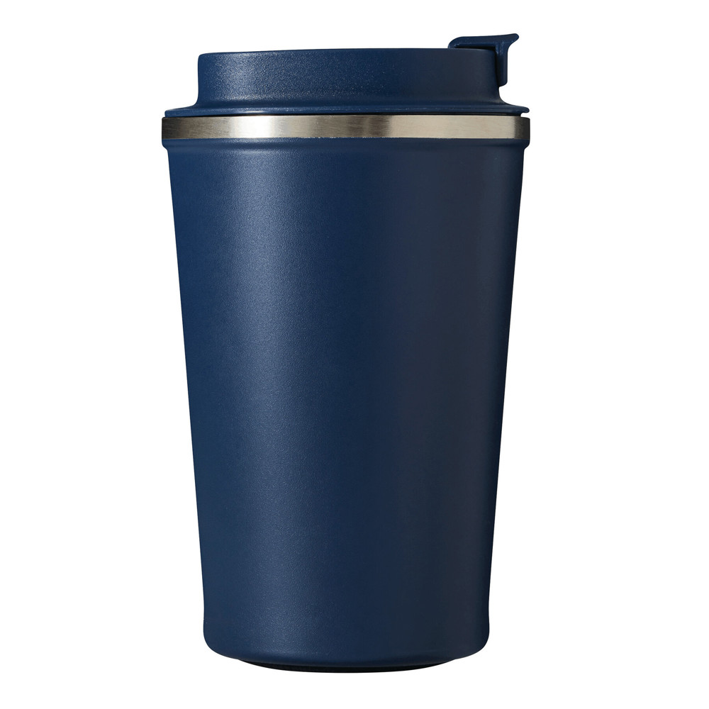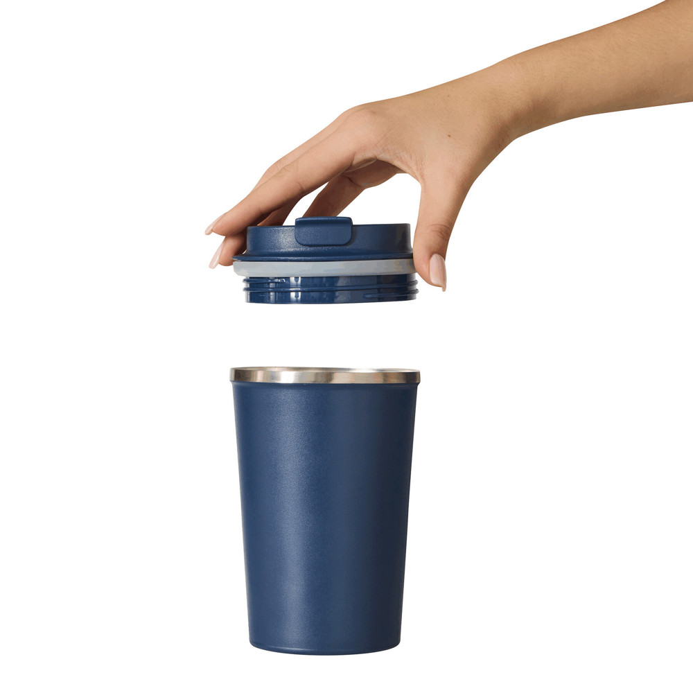 Vacuum insulated travel mug VELOMUG, double-walled: inside made of recycled stainless steel and outside made of stainless steel, secure screw cap in matching colour, silicone sealing ring and built-in flip drinking opening, coated bottom for good surface grip, capacity approx. 350 ml, keeps warm for approx. 8 hours and cold for up to 12 hours, packed in a gift box