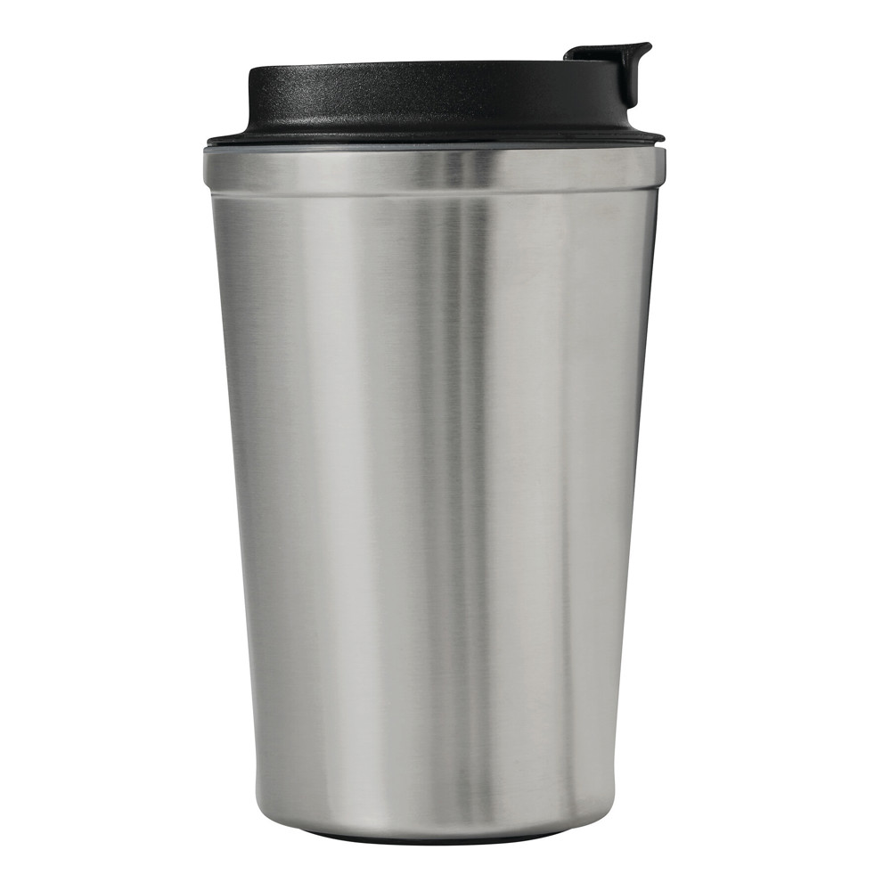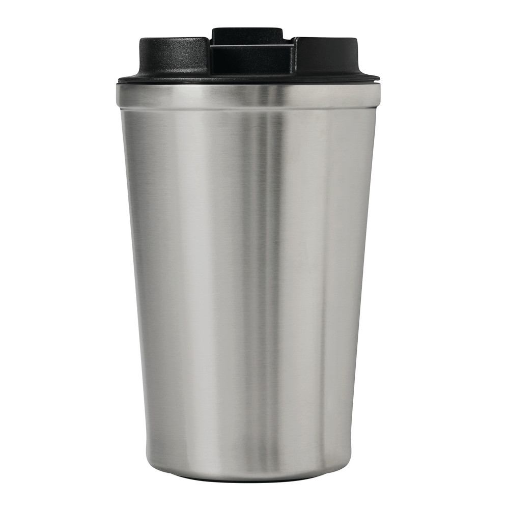 Vacuum insulated travel mug VELOMUG, double-walled: inside made of recycled stainless steel and outside made of stainless steel, secure screw cap in matching colour, silicone sealing ring and built-in flip drinking opening, coated bottom for good surface grip, capacity approx. 350 ml, keeps warm for approx. 8 hours and cold for up to 12 hours, packed in a gift box