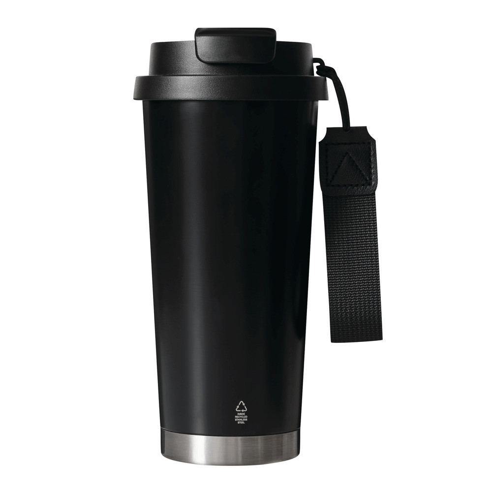 Vacuum insulated travel mug MUG2GO, double-walled: inside made of recycled stainless steel and outside made of stainless steel, secure plastic screw cap in matching colour with double function, built-in drinking opening plus flip-opened straw, silicone sealing ring, and rPET carrying loop, capacity approx. 500 ml, keeps warm for approx. 8 hours and cold for up to 12 hours, packed in a gift box