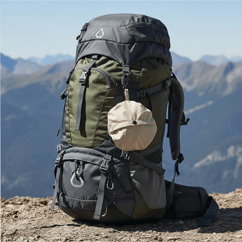 Foldable bucket hat SHADEGO: water-repellent, drawstring with plastic stopper to adjust to head circumference, can be converted into a pouch using a snap button, with carabiner hook (the carabiner is NOT suitable for climbing)
