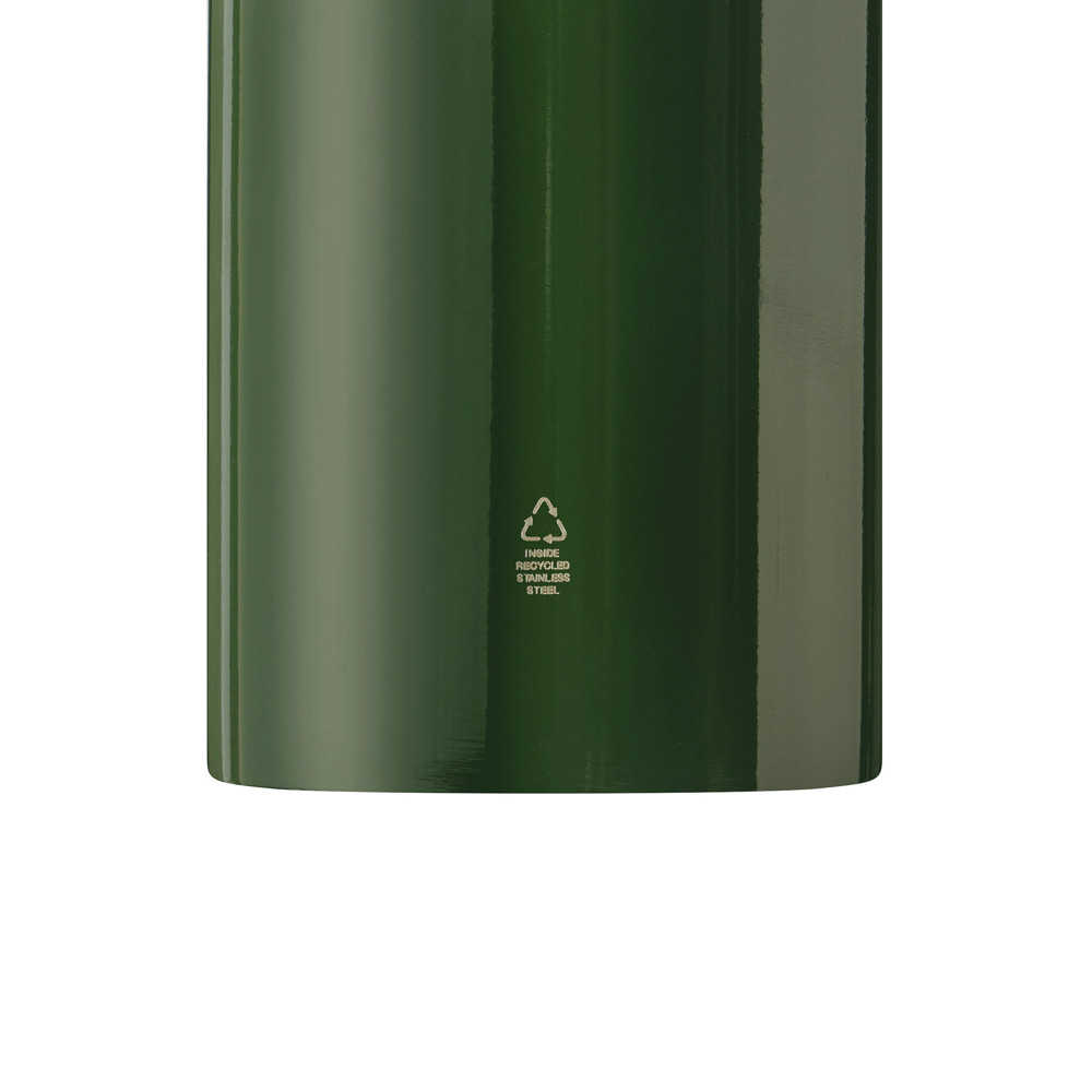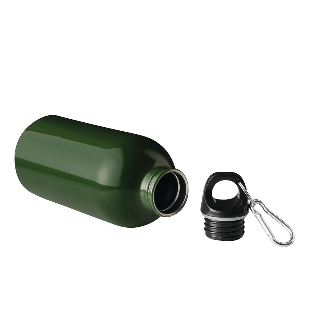Drinking bottle SMALLTRANSIT, single-walled: made of recycled stainless steel, secure black screw cap made of plastic, silicone sealing ring, carrying handle, key ring and carabiner (the carabiner is NOT suitable for climbing), capacity approx. 400 ml