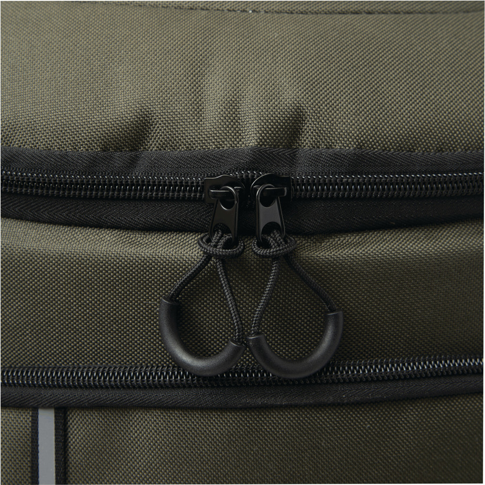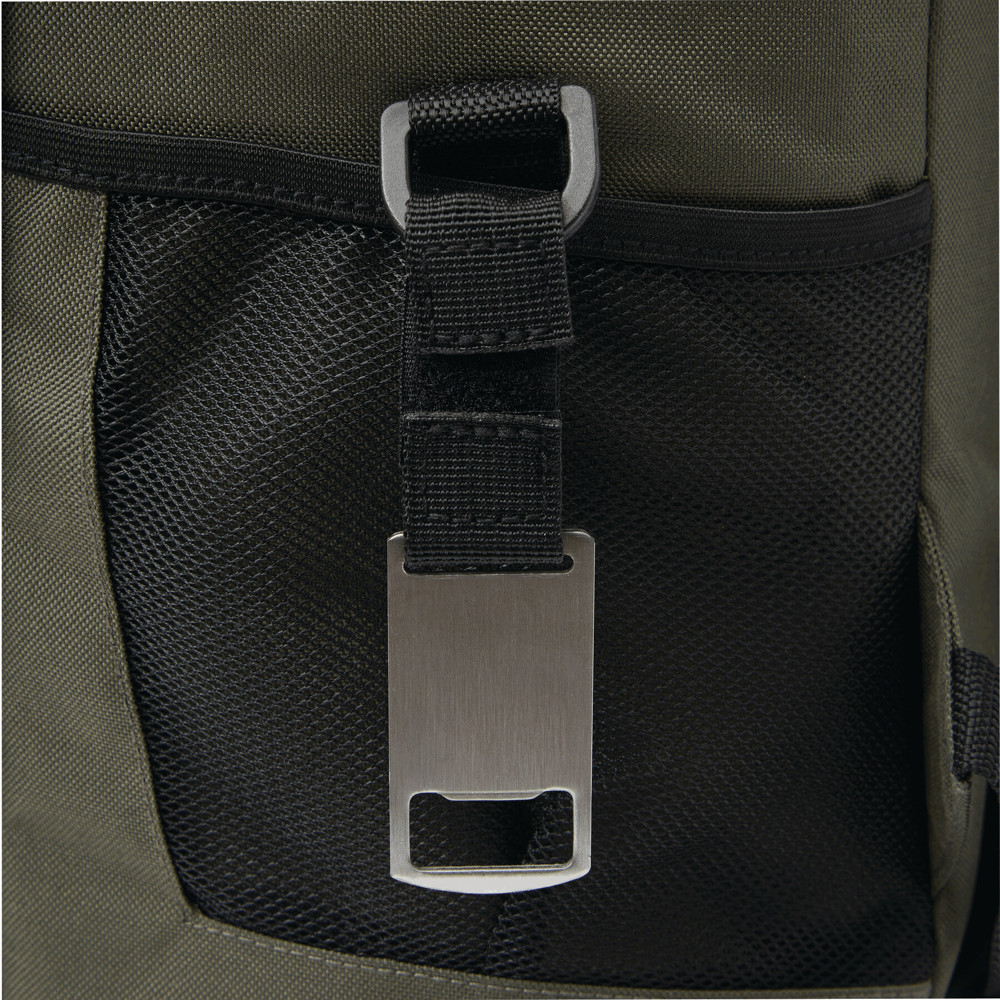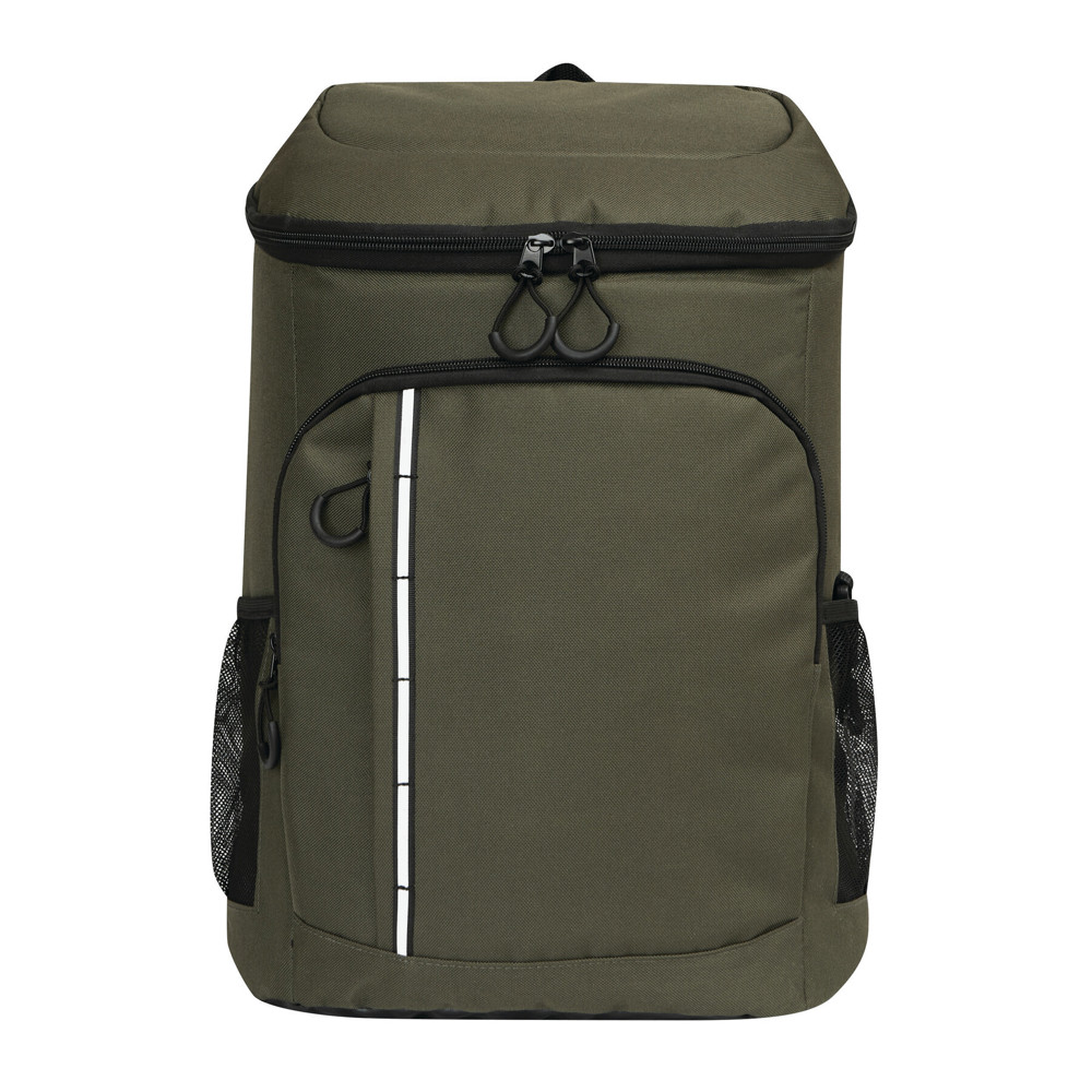 Cooler backpack YUKON: 1 large, zipped, insulated main compartment with PEVA lining, 1 zipped front pocket with mesh compartment, 1 vertical front pocket with zip and reflective strip, 2 lateral mesh pockets, 1 detachable stainless steel bottle opener, water-repellent bottom, adjustable padded shoulder straps, grab handle