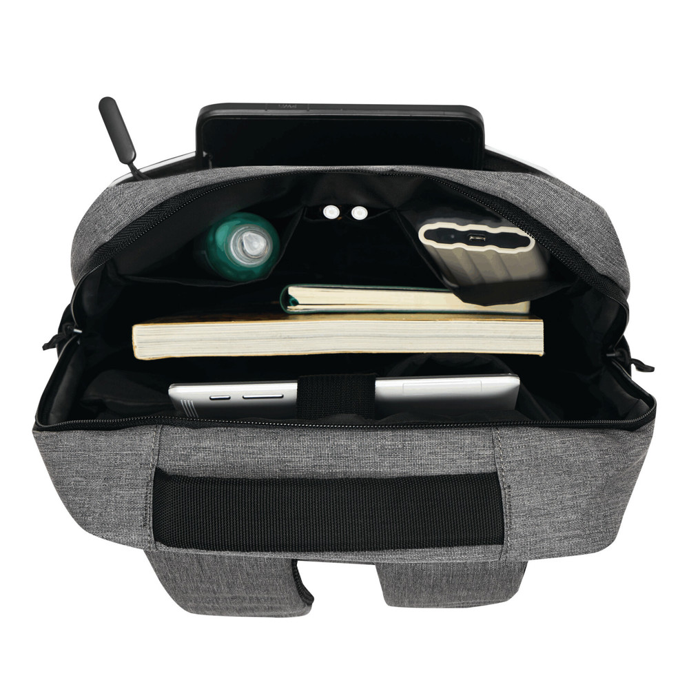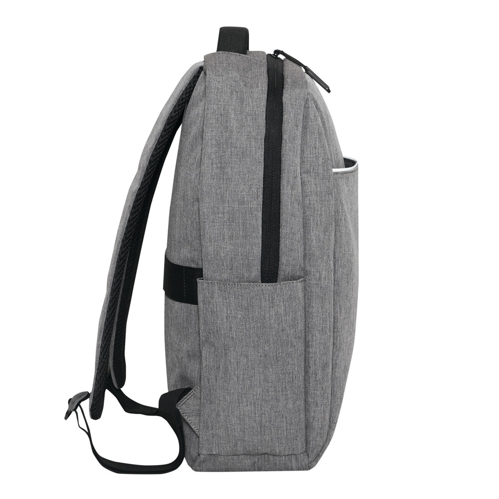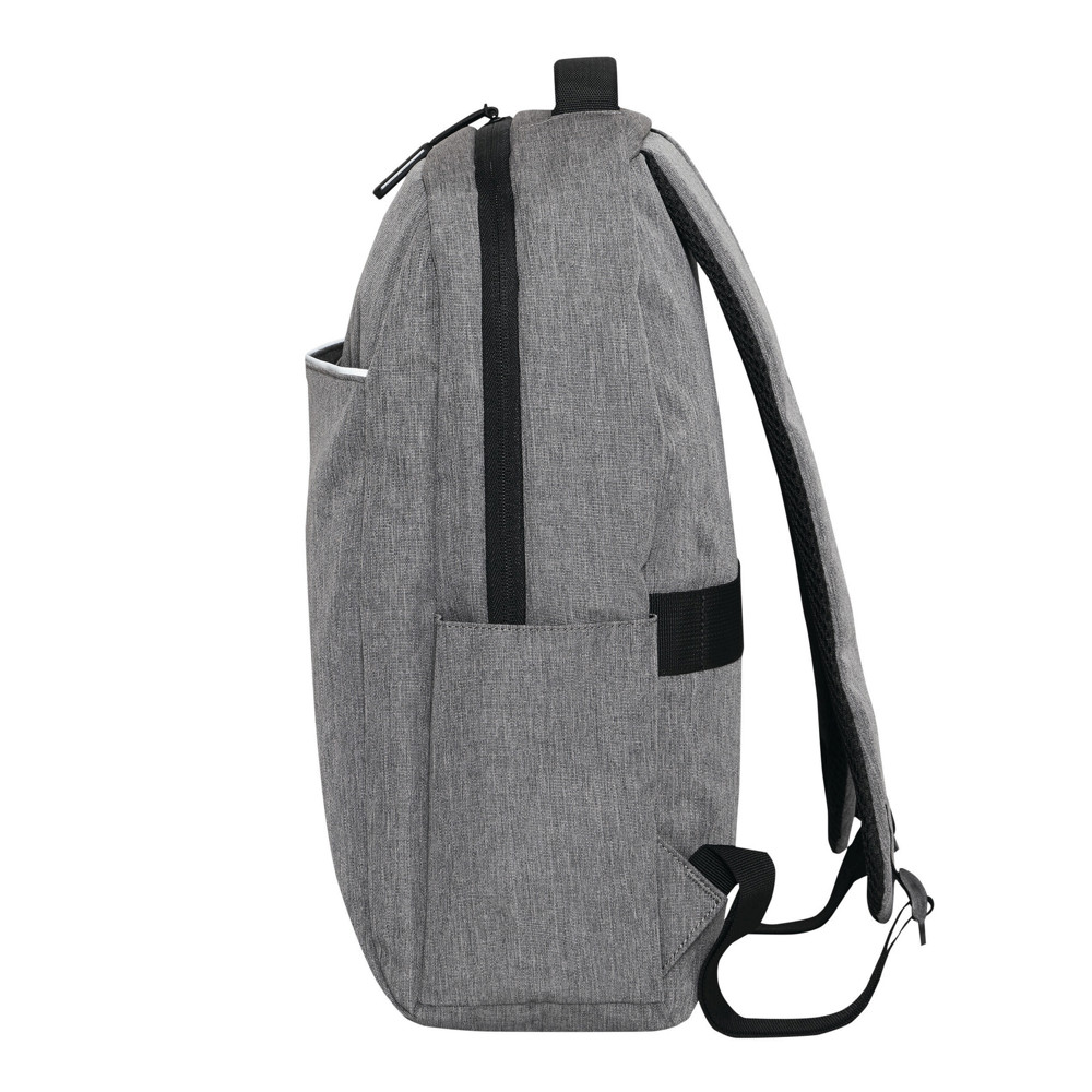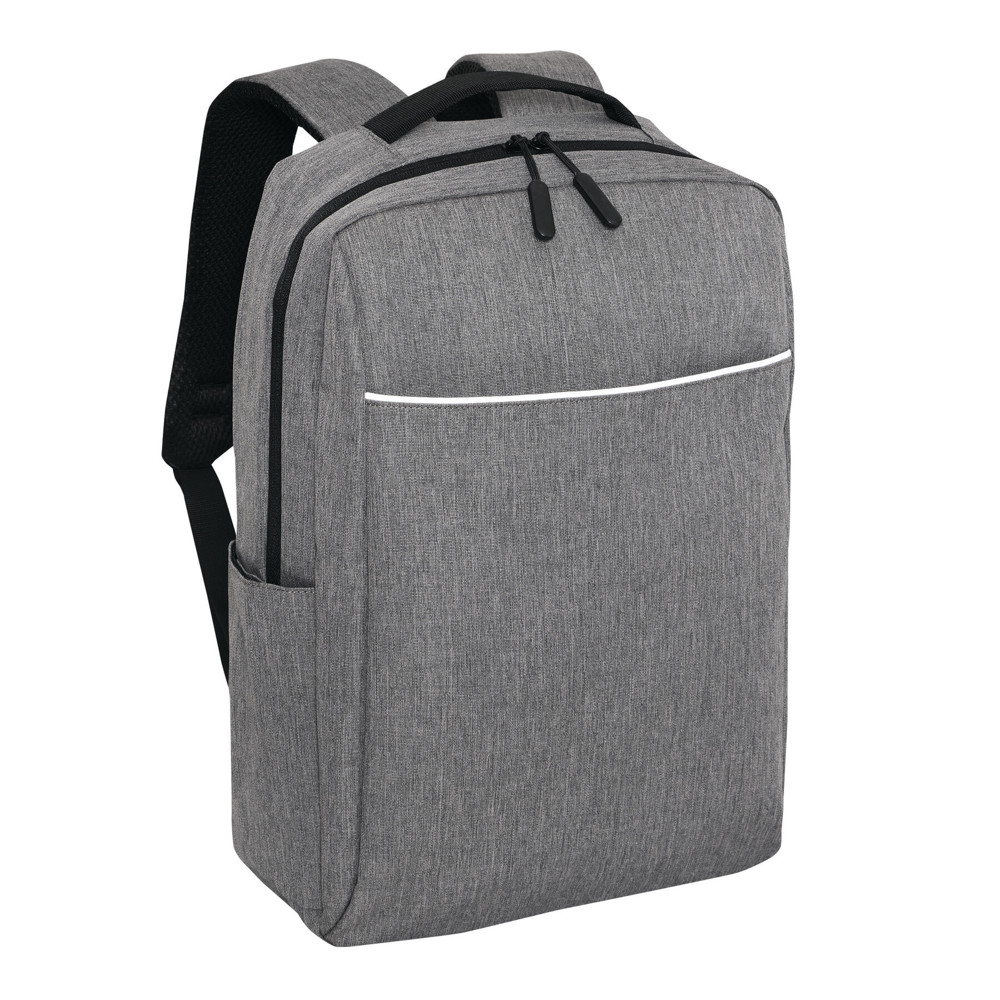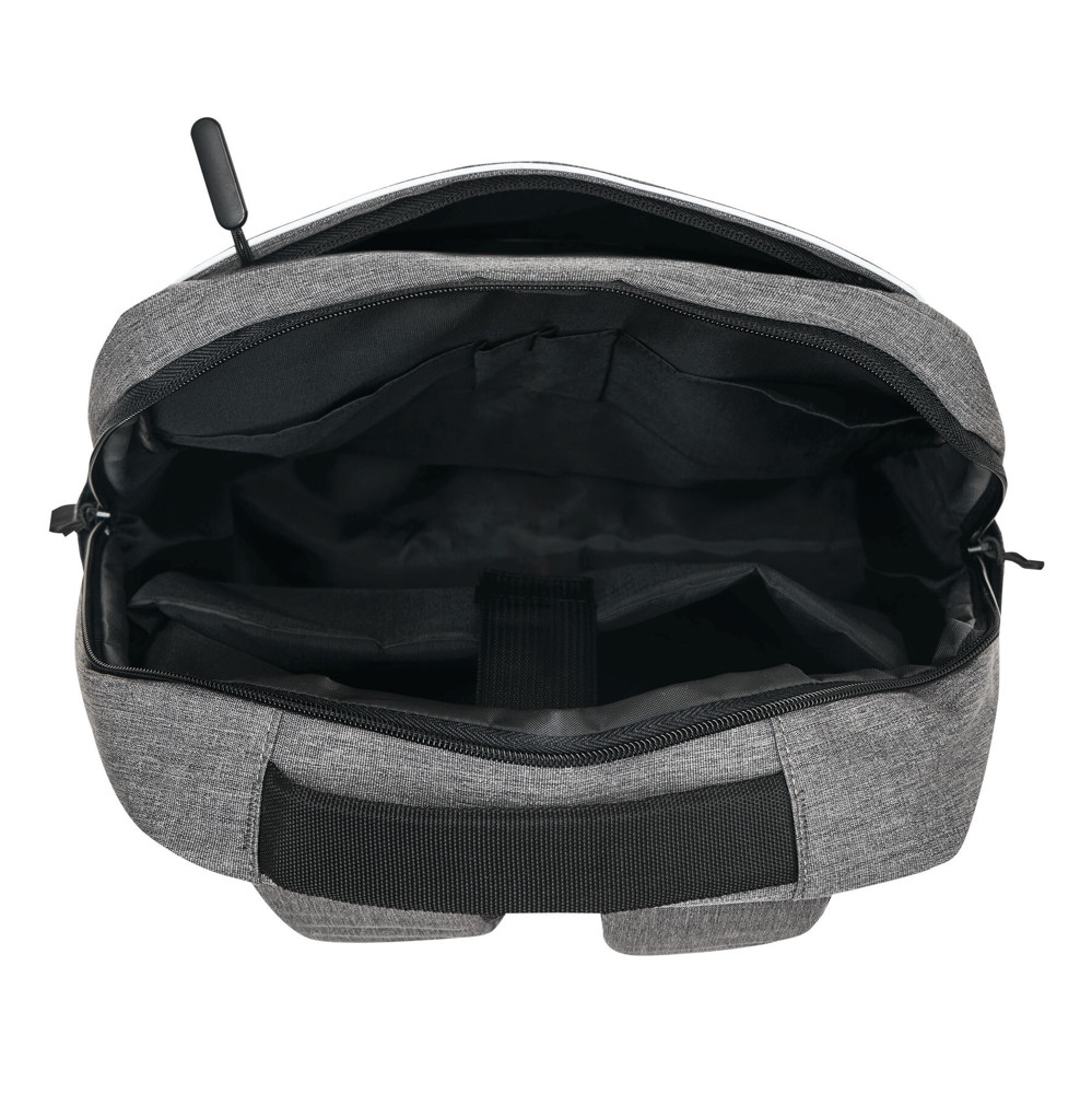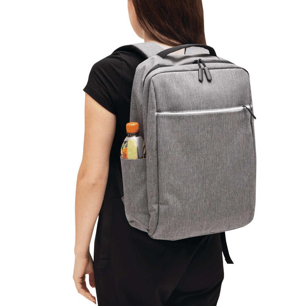 Backpack GHENT: made of recycled polyester (rPET), 1 zipped front pocket with reflector strip, zipped main compartment with padded interior compartment for laptop or tablet, organiser with 4 slip-in pockets, 2 lateral slip-in pockets, padded grab handle, padded and adjustable shoulder straps, trolley sleeve