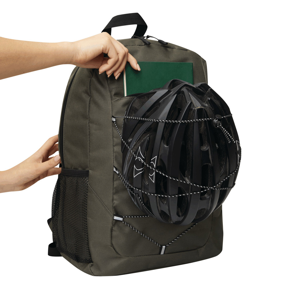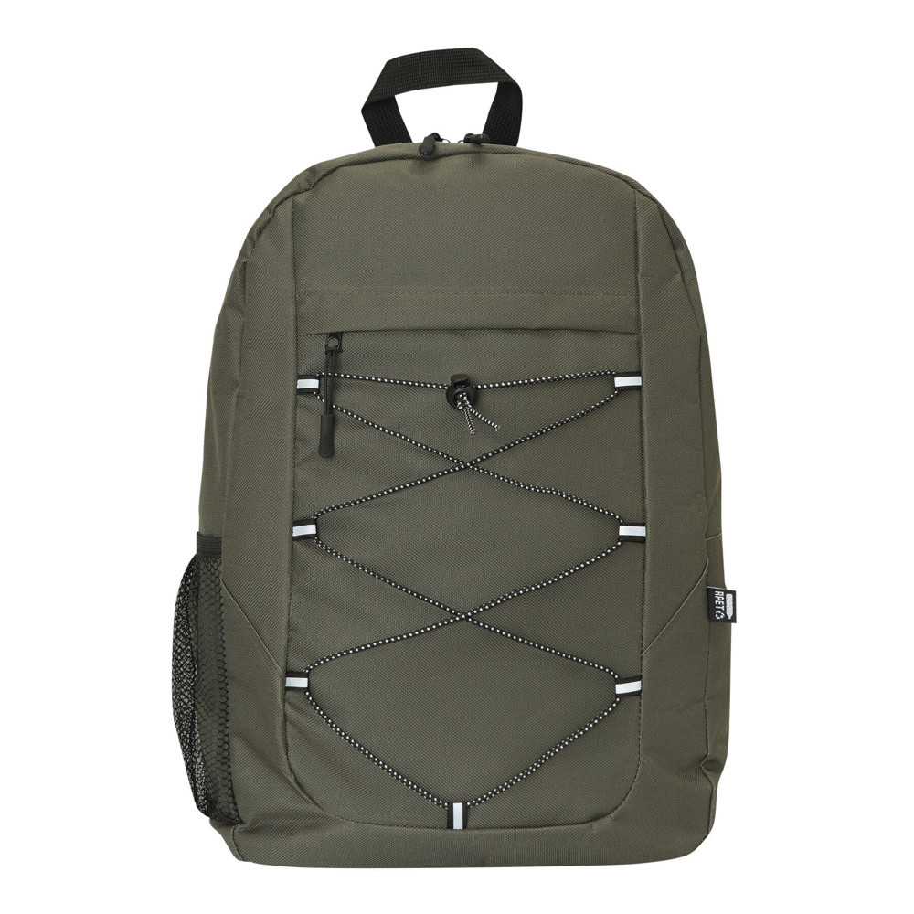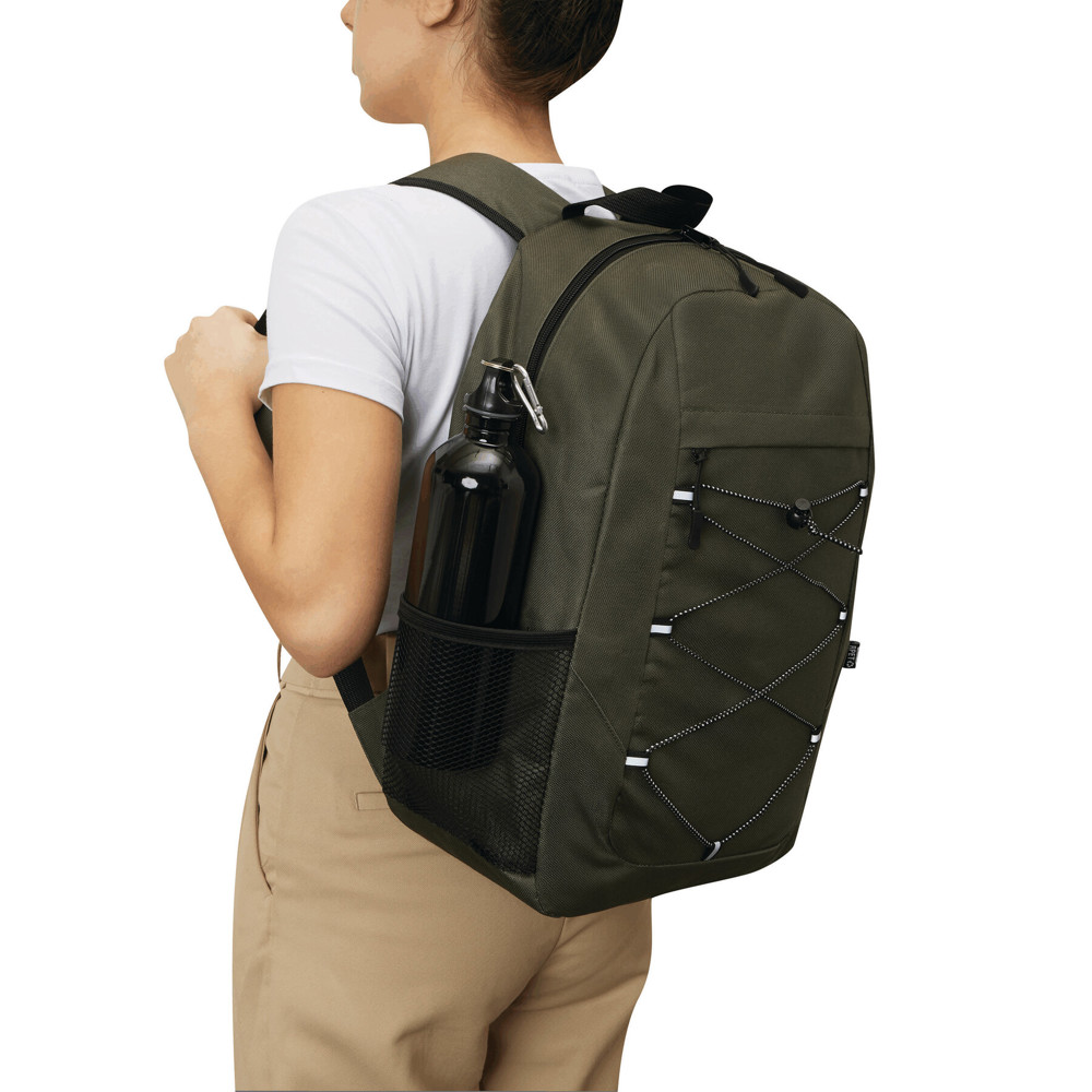 Backpack FARO: made of recycled polyester (rPET), zipped main compartment, zipped front pocket with adjustable elastic drawstring, carrying loop, 1 lateral mesh pocket, padded bottom, adjustable padded shoulder straps