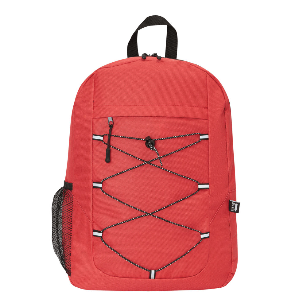 Backpack FARO: made of recycled polyester (rPET), zipped main compartment, zipped front pocket with adjustable elastic drawstring, carrying loop, 1 lateral mesh pocket, padded bottom, adjustable padded shoulder straps