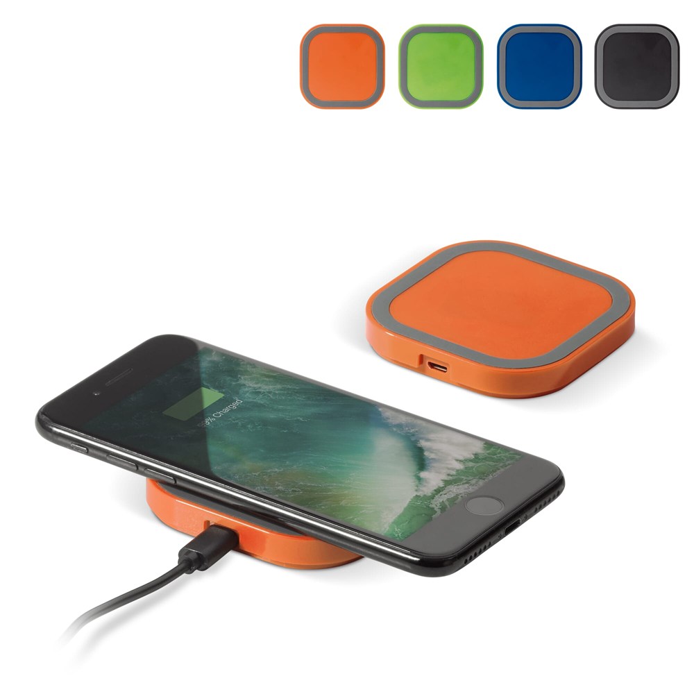 5-Watt wireless charging pad. Flat, small and colourful with a silicone edge that prevents the phone from sliding off. Comes packaged in a gift box.