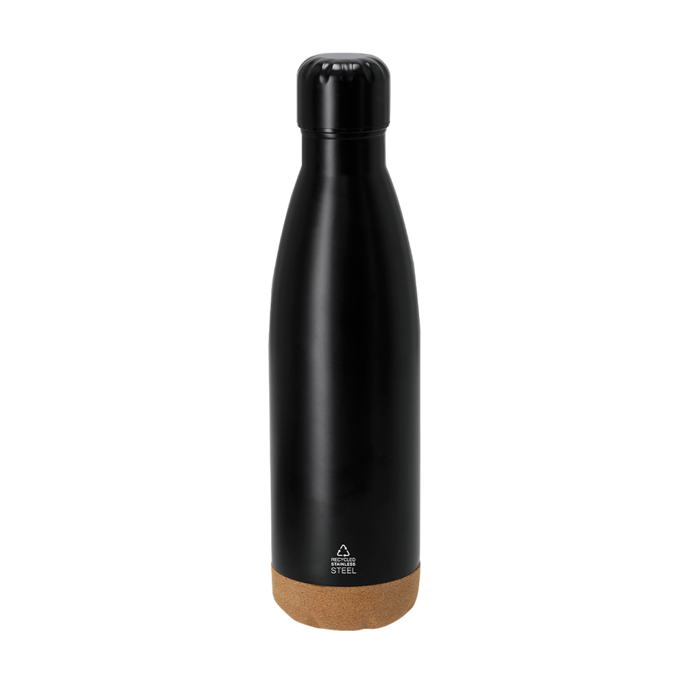 Set of notepad, pen and thermal bottle. Includes:- Rigid cover notepad, made of cork and 300D RPET polyester, fabric bookmark and matching fastening elastic. 80 lined inner sheets. - Pen with cork and aluminum coated body. Elegant matching clip and accessories, with push-button mechanism and in blue ink. - Recycled Stainless Steel thermal drum with a capacity of 500ml, with cork base design. Screw cap. With distinctive Recycled Stainless Steel logo.