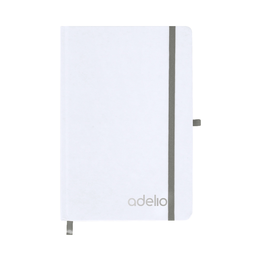 Notepad with rigid white covers made of Recycled Cardboard. Interior with 80 sheets available for a stripe. Includes bookmark, in the same color as elastic closure tape and pen holder. Special for laser engraving showing the selected color.