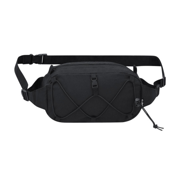 Fanny pack made of 600D RPET polyester. It has a main pocket with invisible zipper closure in black, with black metal puller, and adjustable strap with buckle closure on the strap. On the front it includes an adjustable elastic cord. Includes distinctive RPET label.