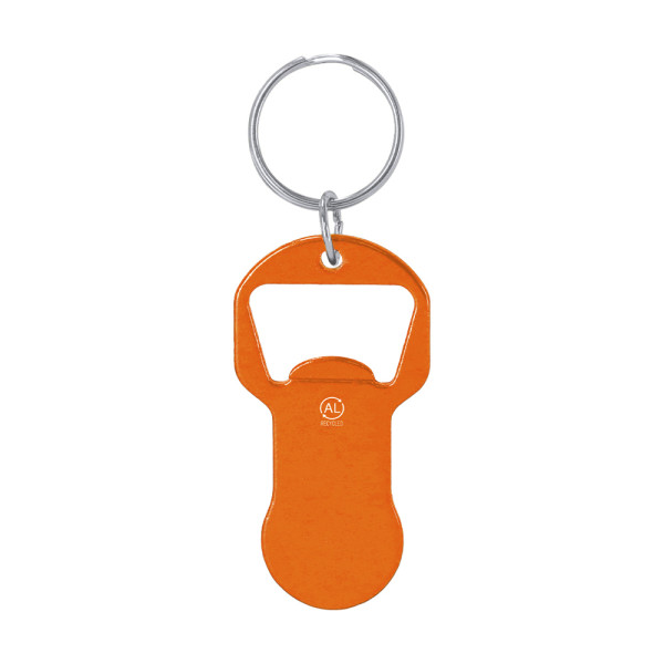Recycled Aluminum coin opener keychain with shiny metallic finish. On the top function bottle... more