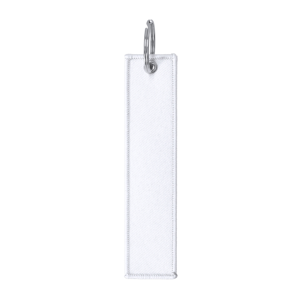 Keychain with seams on the edge in a color matching the polyester body. Includes two silver metal rings. Main ring ideal for keys.