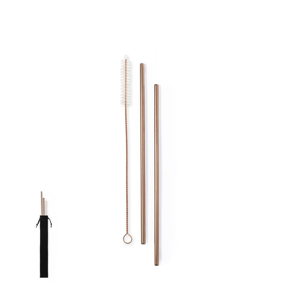 2-piece set of straws made in stainless steel with outside galvanised copper coating. With cleaning brush included and presented in a black suede pouch with drawstring closure.